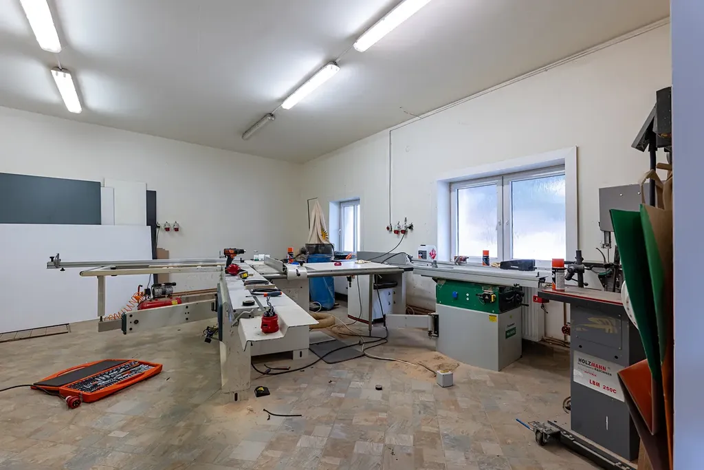 Dům je rozdělen na dvě podlaží : přízemí a první patro. V přízemí nalezneme nebytové prostory využívané především pro potřeby truhlářské dílny (123,2m2) a technickou místnost (2m2) s plynovými kotly vytápějící celý dům. Nabízí se přeměnit tyto nebytové prostory garáž, hernu, posilovnu či sklady. V přízemí se taktéž nachází byt. jednotka dispozice 1+1 (38,7m2) zařízená s kk, koupelnou se sprchovým koutem + WC.