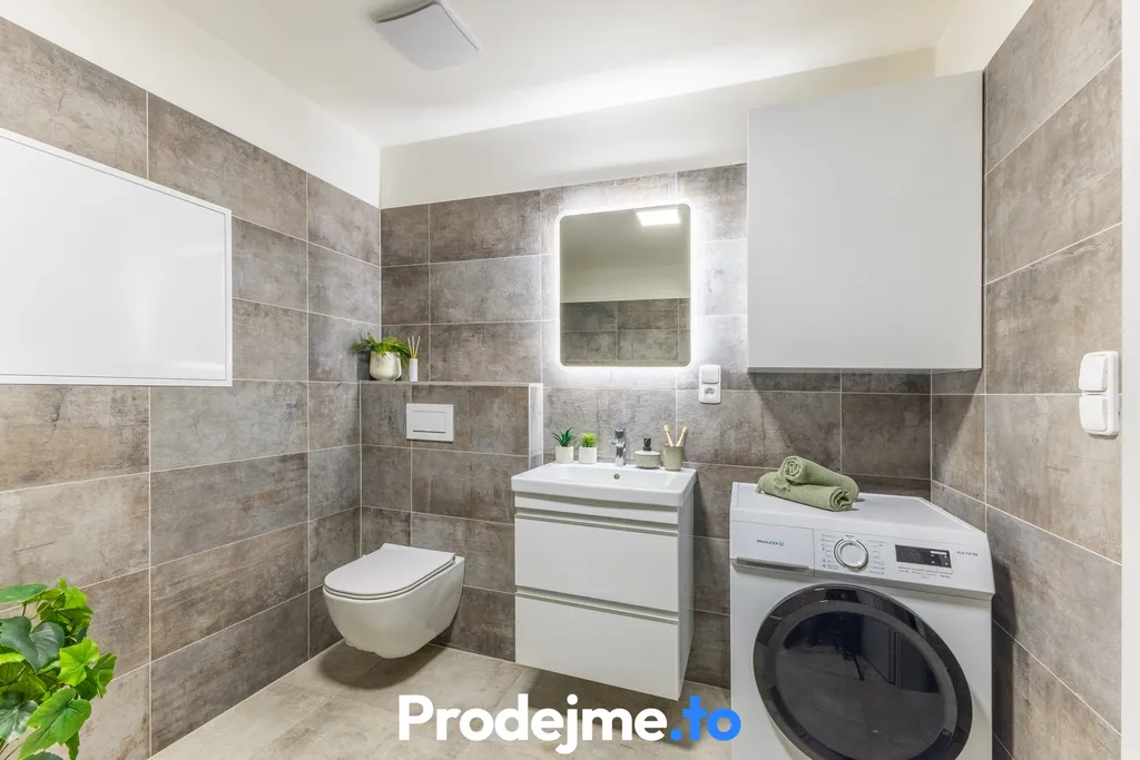 Koupelna je vybavena vanou, toaletou, umyvadlem, pračkou a dvěma otopnými žebříky. O úložné prostory je postaráno díky vestavné skříni na míru v chodbě a vlastnímu sklepu o velikosti 2,5 m2 v suterénu domu.