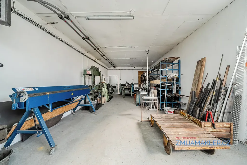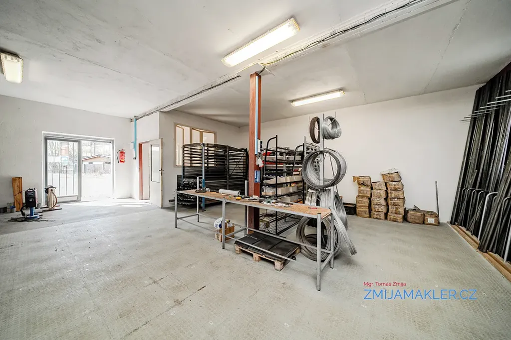 Součástí pozemku je hala o velikosti 641 m2 s kanceláří, prodejnou a dalšími devíti samostatnými dílnami. Dílny mají svůj samostatný vjezd či vchod na obě strany budovy. Budova je zděná, opatřená brizolitovou omítkou, základy budovy jsou provedeny z betonových základových pásů, střecha budovy je sedlová, pokrytá vlnitým plechem. Okna a dveře/vrata v jednotlivých místnostech jsou kovová, místy jsou okna vybavena luxvery. Vnitřní povrch zdí dílen je vyhotoven z vápenné omístky. Elektroinstalace v budově je třífázová, světelná. Vytápění v hlavní dílně je zajištěno kotlem na pevná paliva. V budově je možno obnovit původní připojení k plynu a zajistit tak vytápění objektu plynovým kotlem. Přívod vody, WC a odpady v budově instalovány nejsou. K dispozici je vyvrtaná studna o hloubce 33 m s užitkovou vodou, zatím nepropojená s budovou.