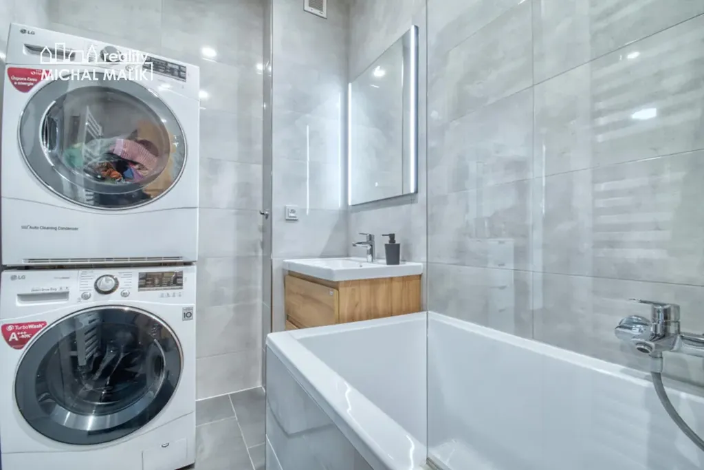 Velkým benefitem bytu je moderní kuchyňská linka vyrobená na míru, která maximálně využívá dostupný úložný prostor. Linka je z kvalitních materiálů s odolnou pracovní deskou a vybavena prémiovým kováním Blum, výsuvnými potravinovými skříněmi, otočným výsuvem pro rohovou skříň a kombinací klasických skříněk s bezúchytkovým systémem Tip-On. Kuchyň je vybavena spotřebiči Whirlpool, Bosch a Amica.