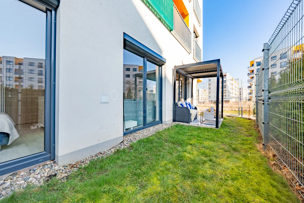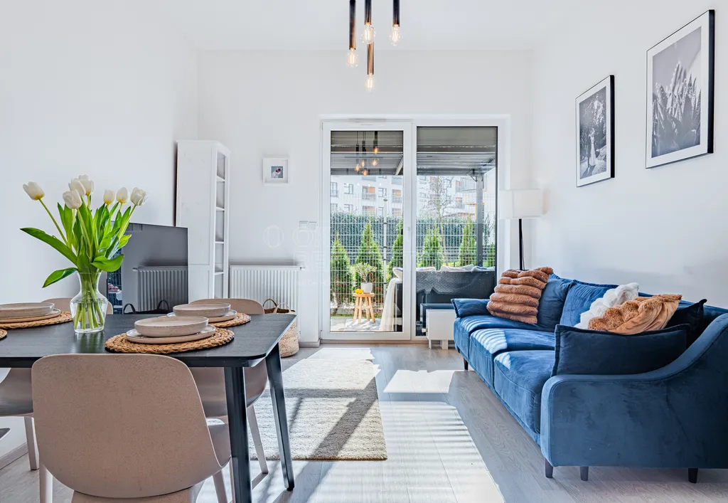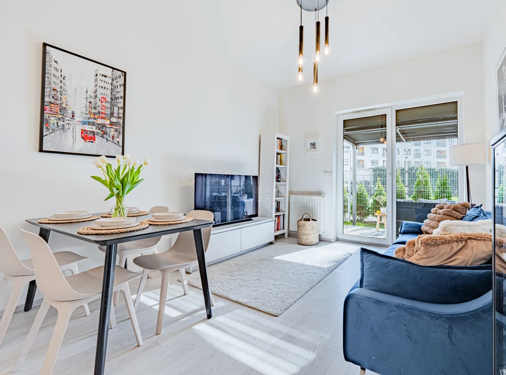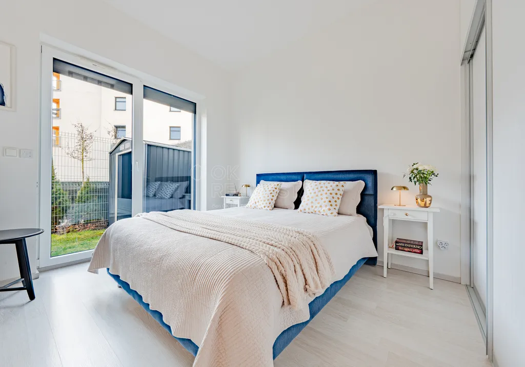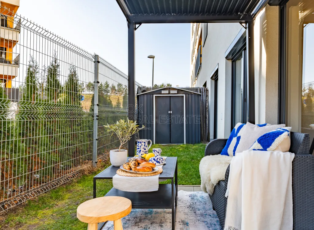 Dominantou bytu je obývací pokoj s kuchyňským koutem a přímým napojením na venkovní prostor. Velkým benefitem je vstup na předzahrádku z každého pokoje, což výrazně zvyšuje komfort bydlení a propojení interiéru s exteriérem.