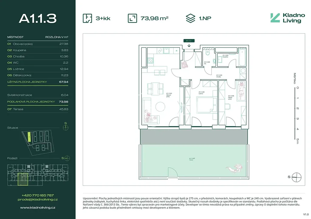 Nabízíme ke koupi moderní byt 3+kk o podlahové ploše 74 m² s terasou 45,8 m² v rezidenčním projektu Kladno Living, který vzniká v jedné z nejatraktivnějších lokalit města Kladno – Kročehlavy. Tento nový developerský projekt představuje jedinečnou příležitost pro ty, kteří hledají nové byty v Kladně nebo investici do nemovitosti s vysokým potenciálem zhodnocení.