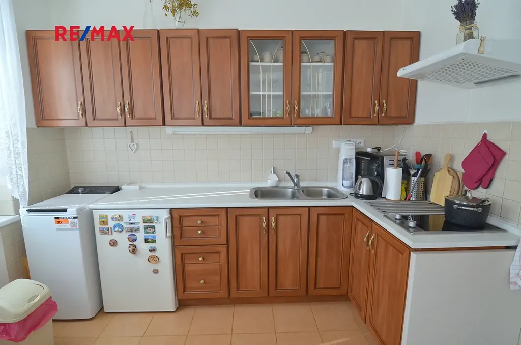 Byt je vybaven kuchyňskou linku s lednicí s mrazákem, varnou deskou, digestoří a pračkou. Navazující prostor obývacího pokoje umocňuje a zesvětluje vestavěná skříň po celé šířce pokoje s posuvnými dveřmi, které jsou zrcadlové.