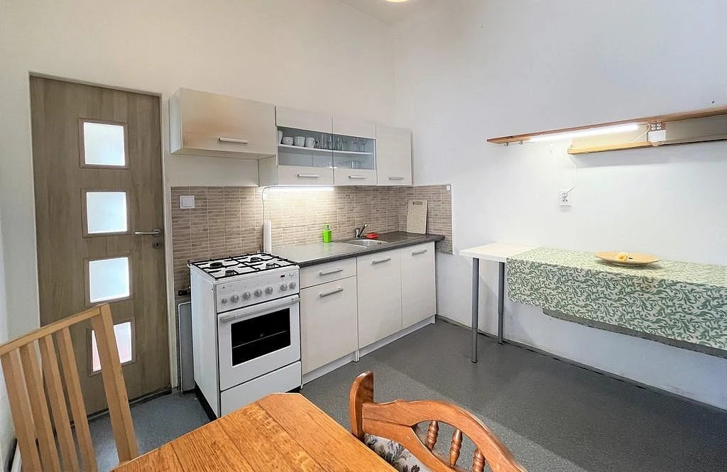 Po levé straně vstupujeme do útulné kuchyně o výměře cca 9,1 m and sup2;, která je vybavena kuchyňskou linkou, kombinovaným sporákem, lednicí a jídelním stolem se židlemi. Kuchyně je orientována na západ.