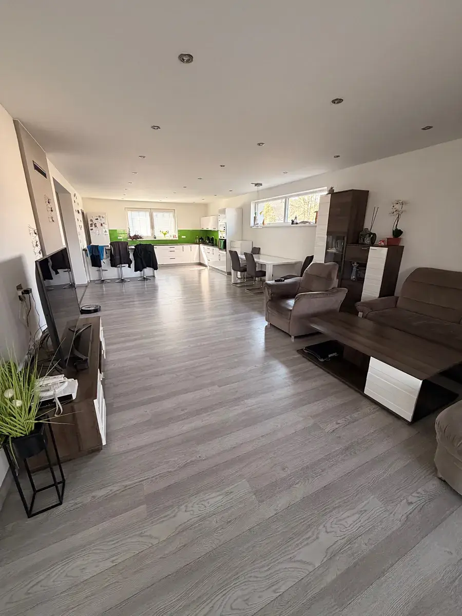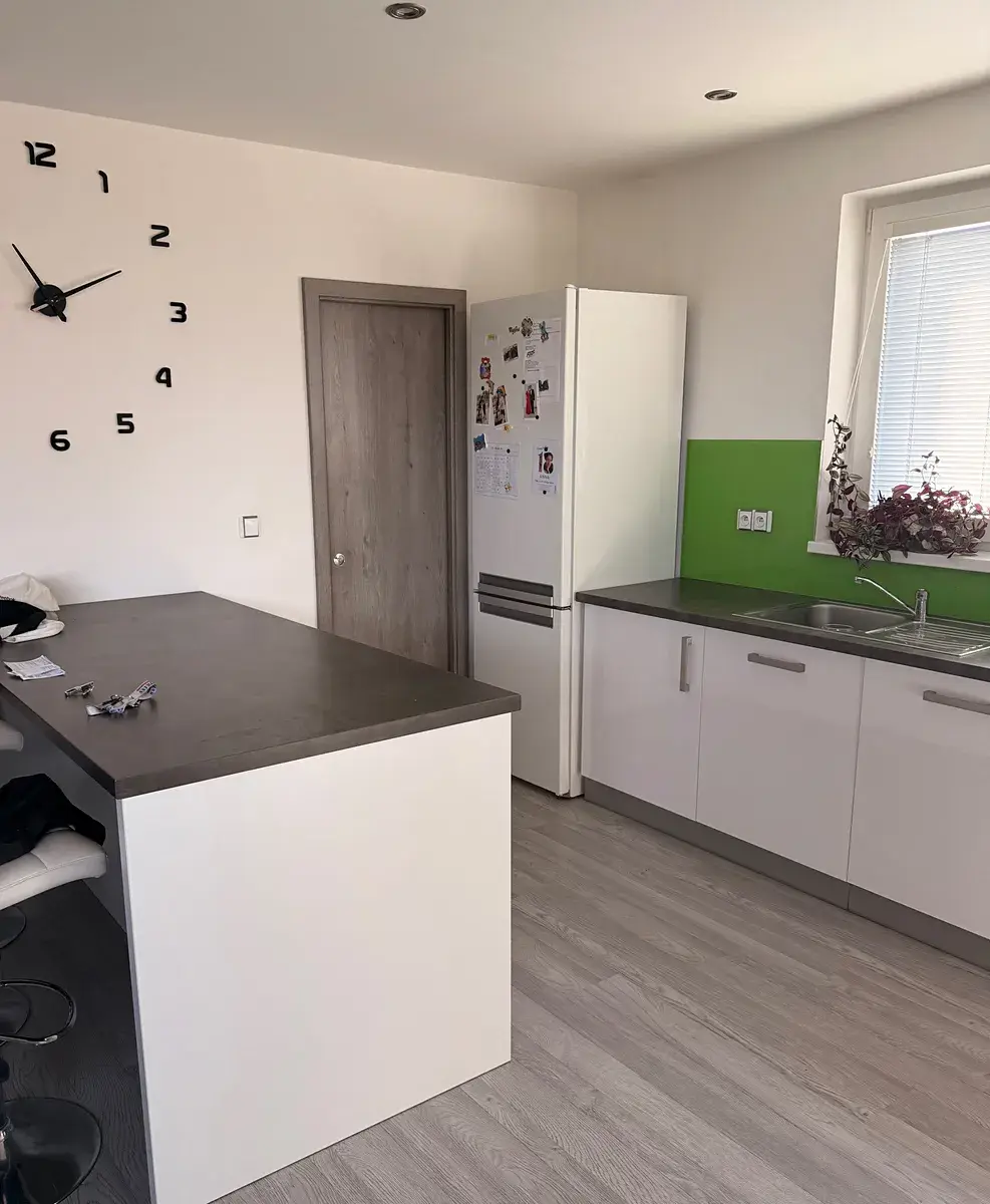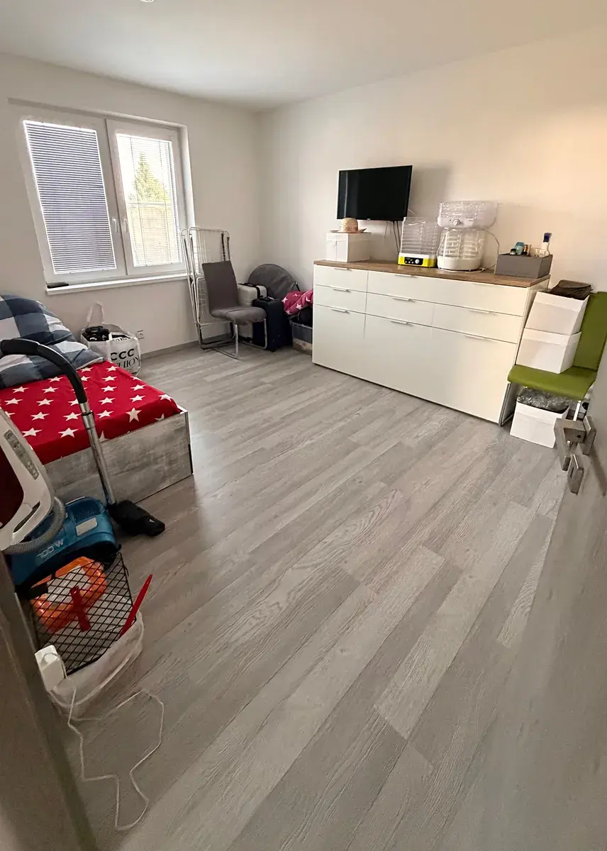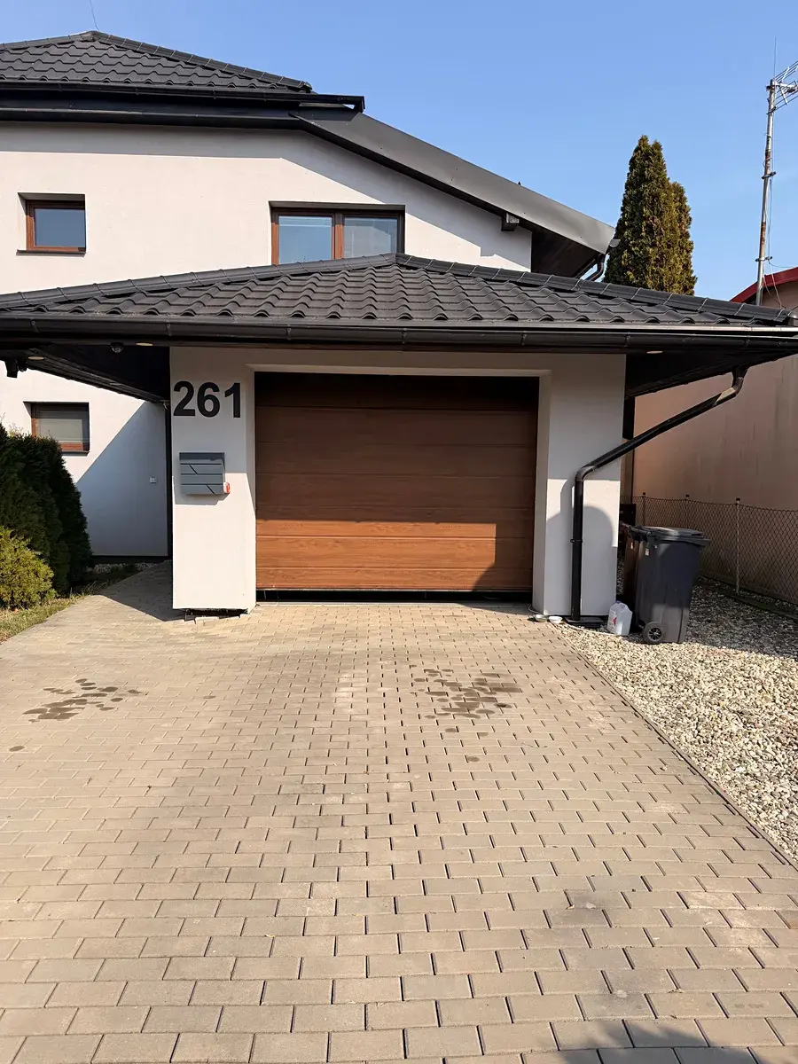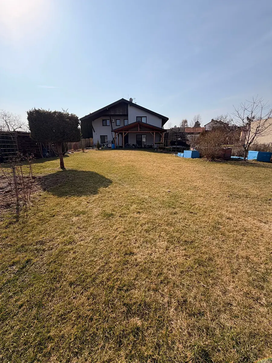 Za vstupem do domu se nachází prostorná předsíň, ve které jsou vestavěné skříně na míru a vstup do garáže. Za vstupní předsíní se nachází prostorná chodba, ze které jsou samostatné vstupy do jednotlivých místností, v tomto případě do prostorného obývací pokoje s kuchyní a jídelnou, dále pak do koupelny, samostatného WC a chodby vedoucí do zadní části domu – na terasu a zahradu. V prostorném obývacím pokoji, která navazuje na kuchyň, se nachází kuchyňská linka na míru s kvalitními vestavěnými spotřebiči, jídelna s krbem, který má zadní plnění a který je zaveden do podlahového topení v celém domě a vzhledem k malé energetické náročnosti domu, se krb využívá jako samostatný zdroj vytápění. Druhý zdroj vytápění je elektrický kotel Protherm a klimatizace Sinclair. Z obývacího pokoje je také vstup na terasu a následně i zahradu. V 1.patře, do kterého se dostanete prostorným prosvětleným schodištěm, se nachází jeden velký pokoj (tento pokoj lze rozdělit na 2 samostatného pokoje a tím zvětší dispozici domu. Dále pak ložnice a další velký pokoj. V patře se nachází druhá prostorná koupelna s vanou, ve které je i sauna, dále pak samostatné WS a technická místnost, kde se nachází záložní zdroj vytápění v podobě elektrického kotle Protherm a akumulační nádoby na teplou vodu. Podlahy v domě jsou vinylové, mimo dlažby ve vstupní chodbě, v koupelnách, WC, technické místnosti a v garáži. Dům má také půdu, kterou je možno využít jako skladovací a odkládací prostor. Venkovní část domu tvoří terasa o výměře 18,125 m², která se nachází u obývacího pokoje se samostatným vstupem prostřednictvím francouzských dveří. Podrobnější informace na telefonu.