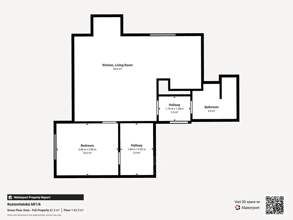 Dispozice bytu je promyšlená a funkční – kromě obývací části nabízí ložnici, prostornou samostatnou šatnu, koupelnu s toaletou a sprchovým koutem a chodbu s vestavěnou skříní. Ložnice, koupelna a obývací prostor jsou vyvedeny v omyvatelné dekorativní betonové stěrce, což dodává interiéru moderní a praktický charakter. Samozřejmostí jsou podomítkové baterie, kvalitní vinylové podlahy, pečlivě vybrané materiály a sladěné designové prvky.