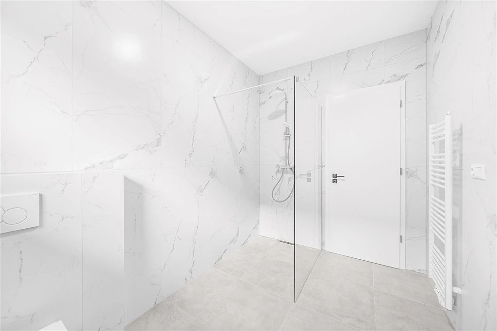 Dispozice interiéru je navržena s důrazem na funkčnost a komfort. Koupelna je vybavena moderními velkoformátovými obklady a celý dům je připraven na instalaci předokenních žaluzií či rolet.