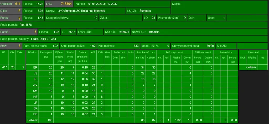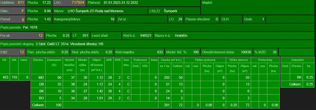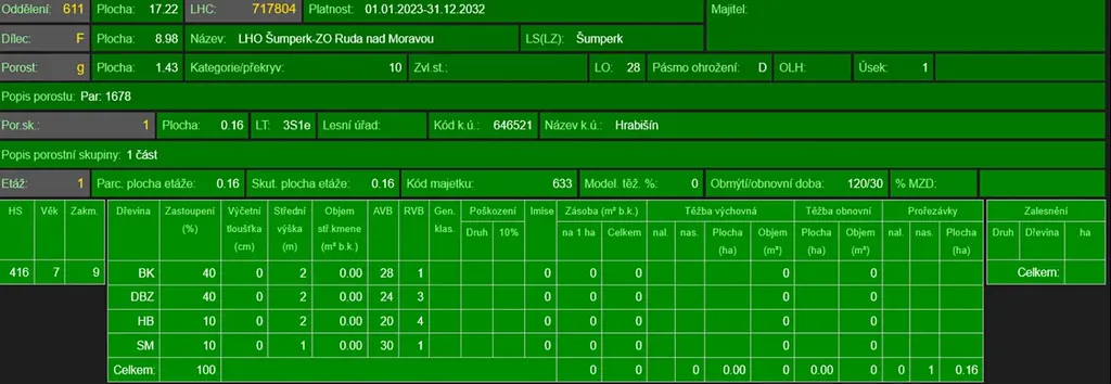 - p.č. 1678 vedená jako lesní pozemek o celkové výměře 14 248 m2, z toho vlastníme podíl 1/3 tedy 4 749 m2 (stáří lesa 122 let - zastoupení dřevin modřín, dub, buk, borovice, stáří lesa 28 let - zastoupení dřevin bříza, jasan, javor, vrba, smrk, habr, jeřáb ptačí, buk, dub, stáří lesa 10 let - zastoupení dřevin buk, dub, habr, smrk)