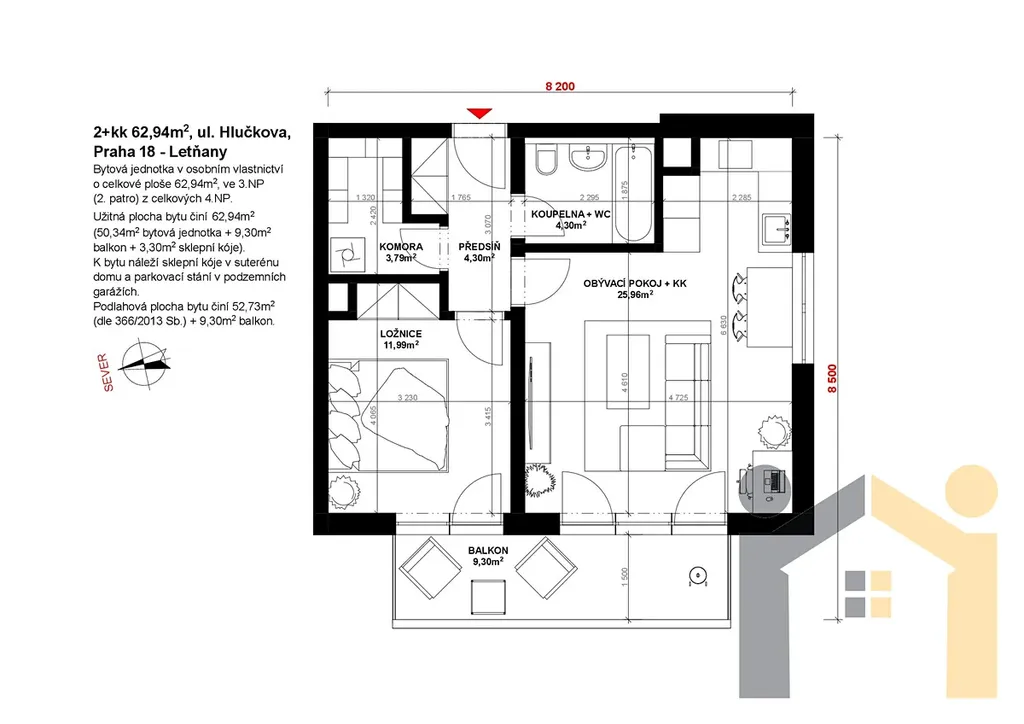 Podlahová plocha bytu je 52,73m2, užitná plocha 50,34m2. K bytu náleží velký balkon 8,80 m2, sklep 3,30m2 a vnitřní parkovací stání v podzemní garáži. Druhé parkovací stání mají současní majitelé pronajaté od sousedů a s velkou pravděpodobností bude možné v nájemní smlouvě pokračovat. Je zde umístěn kamerový systém.