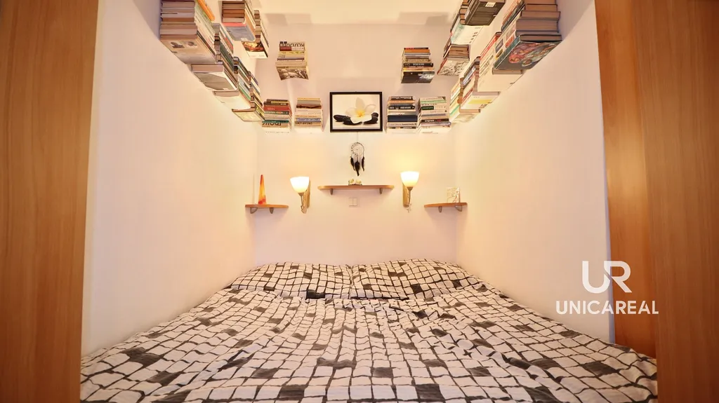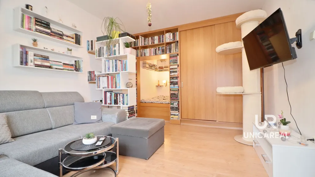 V obývacím pokoji byl vkusně vybudován spací prostor s úložnými policemi a šatní skříní.