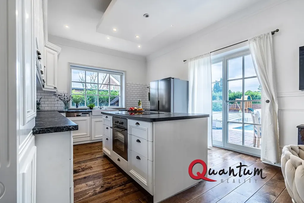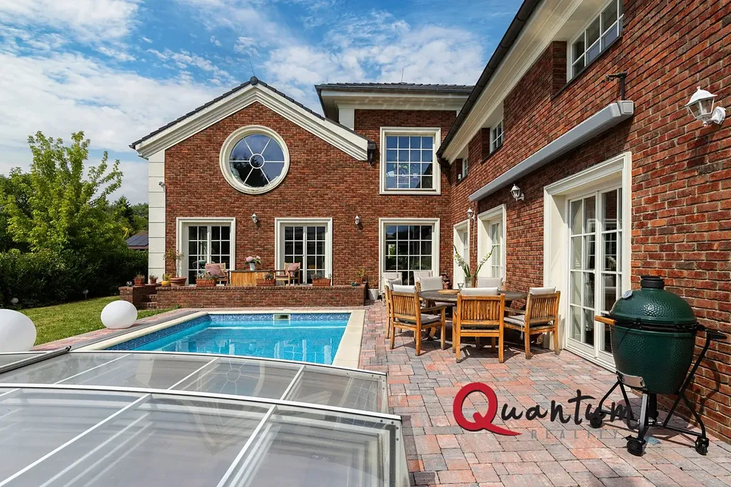 Kvalitní materiály a stylové provedení – fasáda v anglickém stylu, elegantní detaily a propracovaný interiér, který zachovává styl domu.