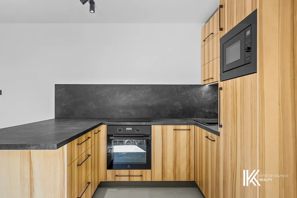 V prvním patře se nachází obývací části s moderní kuchyňskou linkou vybavenou vestavěnými spotřebiči – elektrickou troubou, varnou deskou, mikrovlnnou troubou, lednicí s mrazákem a myčkou. Kuchyňský prostor je doplněn o promyšlené úložné prostory po celém obvodu zdi.
