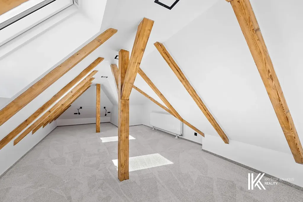 Ve druhém patře se nachází velká podkrovní místnost s odhalenými dřevěnými trámy, která prostoru dodává útulný a přirozený charakter. Skvěle poslouží jako dětský pokoj s hernou.