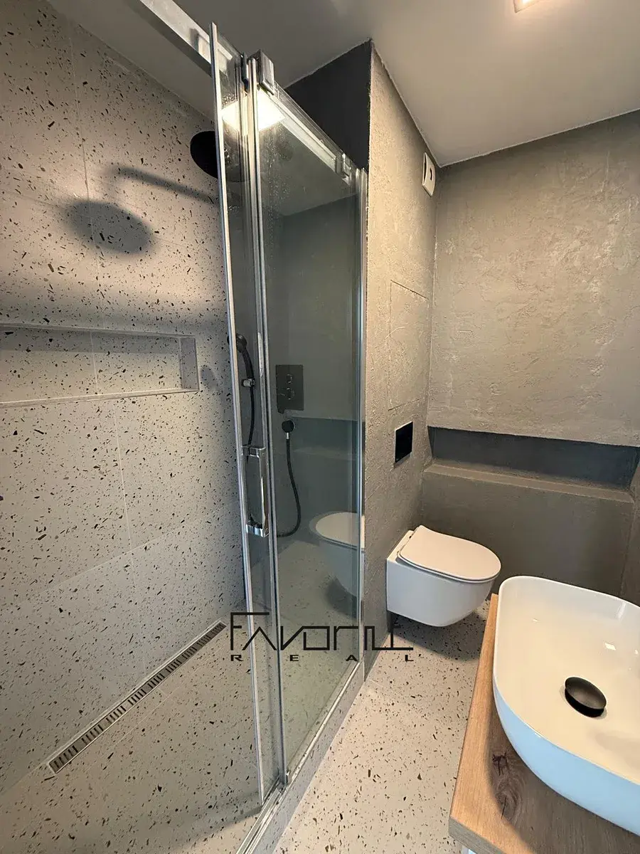 V koupelně velkoformátové obklady, dlažba, umyvadlo se skříňkou, baterie, zrcadlo, sprchový kout.