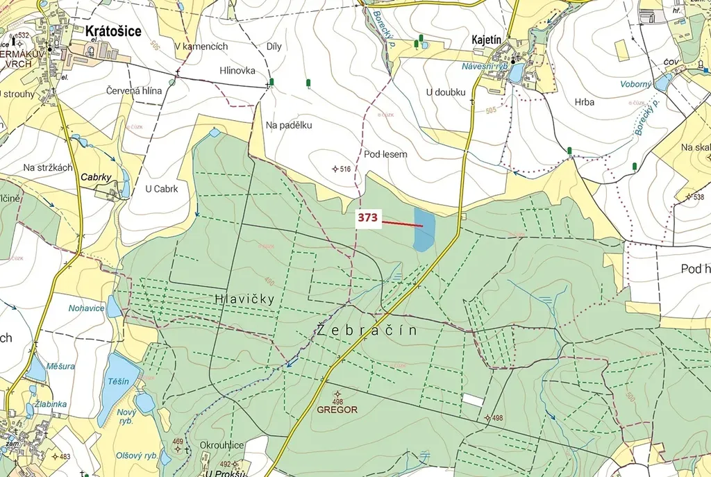 Lesní pozemek o výměře 25 608 m2, parcelní číslo 373, podíl 1/1, katastrální území Kajetín, obec Choustník, obec s rozšířenou působností Tábor, okres Tábor, Jihočeský kraj. Částečně po těžbě.