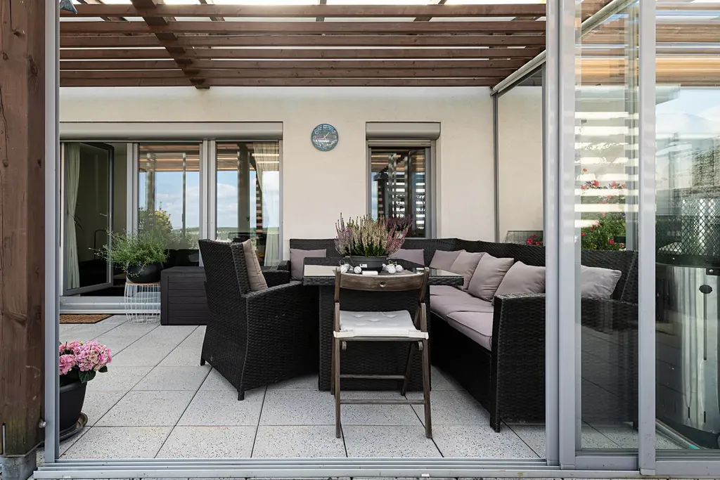 Francouzská okna v obývacím i dětském pokoji umožňují vlastní vstup na prostornou terasu, která je částečně zastřešená, což zajišťuje její pohodlné využívání i za nepříznivého počasí. Součástí terasy je nově vybudovaná zimní zahrada o rozměrech 2,8 × 6,6 metru.