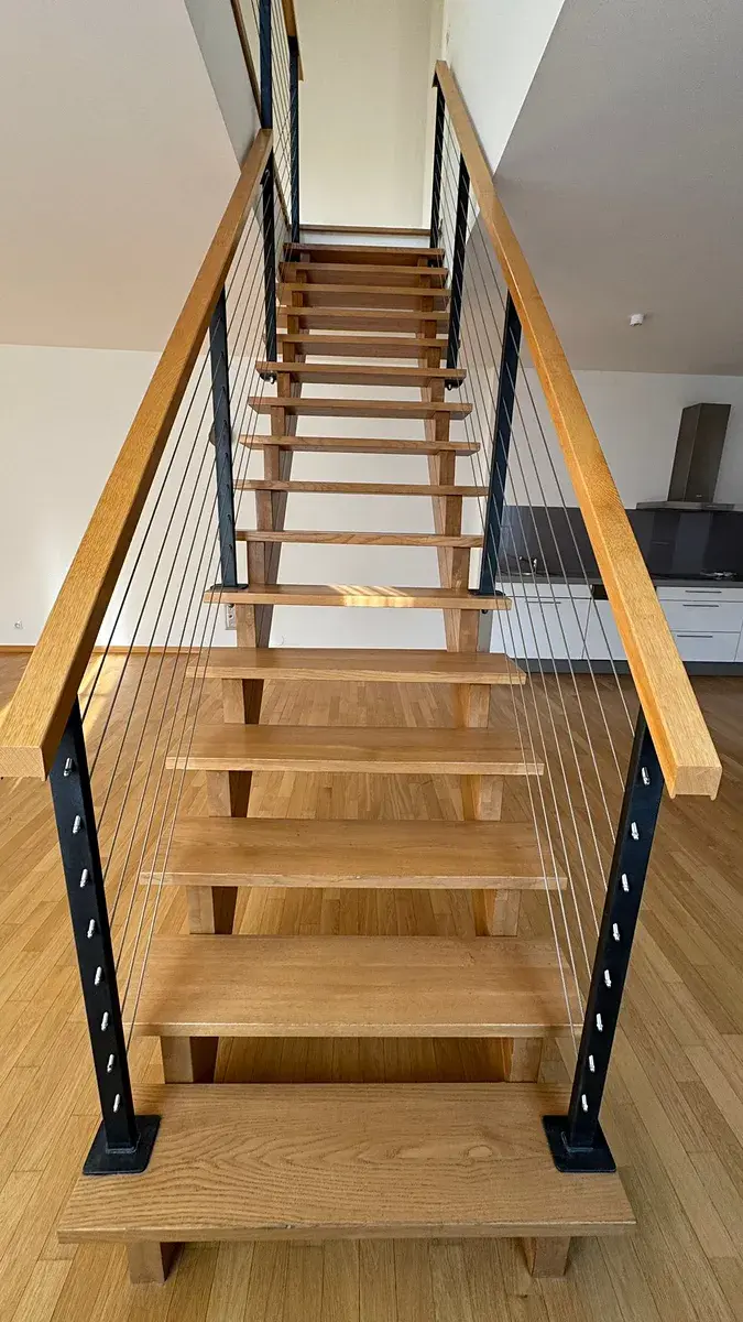 Moderní kuchyňská linka je plně vybavena vestavěnými spotřebiči. Byt disponuje dvěma samostatnými pokoji v horním patře, které lze využít jako ložnici a pracovnu či další pokoj. Koupelna je prostorná a nabízí jak sprchový kout, tak vanu.