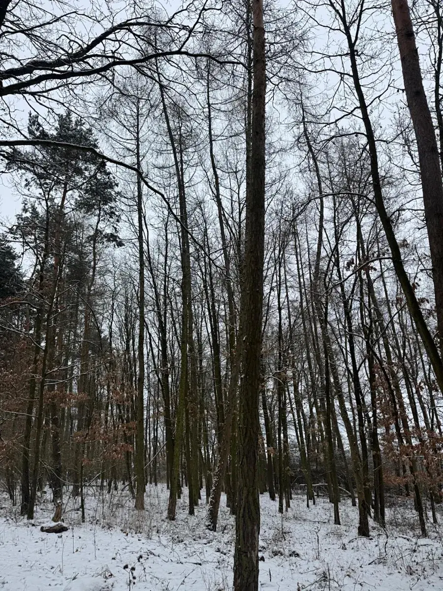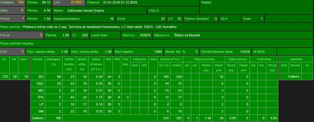 - p.č.2041 vedená jako lesní pozemek o celkové výměře 15 767 m2, z toho vlastníme podíl 1/4 tedy 3 942 m2 (stáří lesa 60 let - zastoupení dřevin borovice, dub, modřín, topol, lípa, smrk).