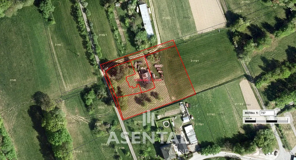 Na pozemku se nachází starší zděná hospodářská budova, která není evidována v katastru nemovitostí.