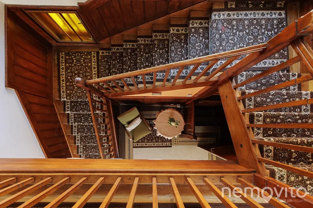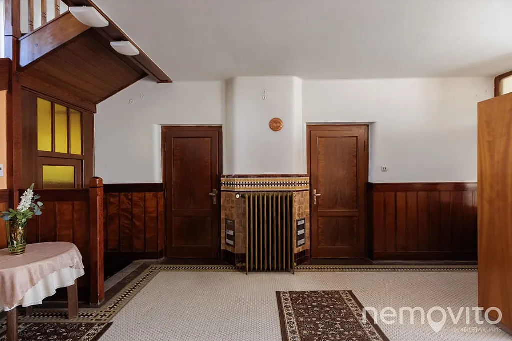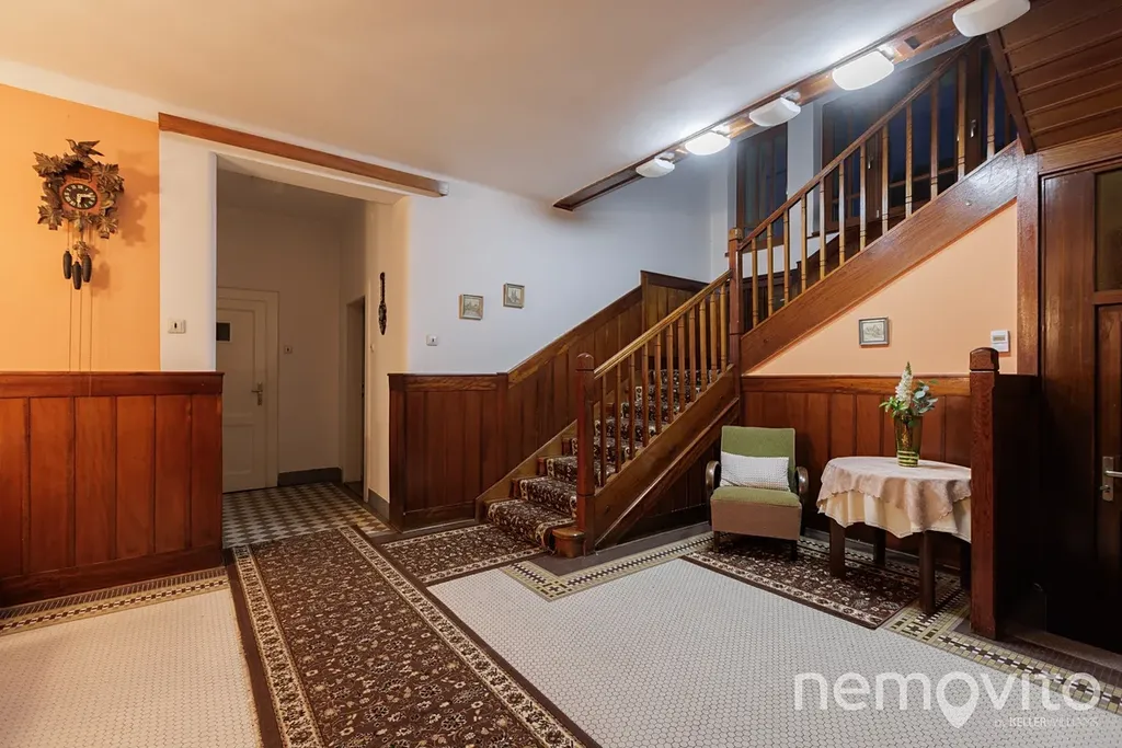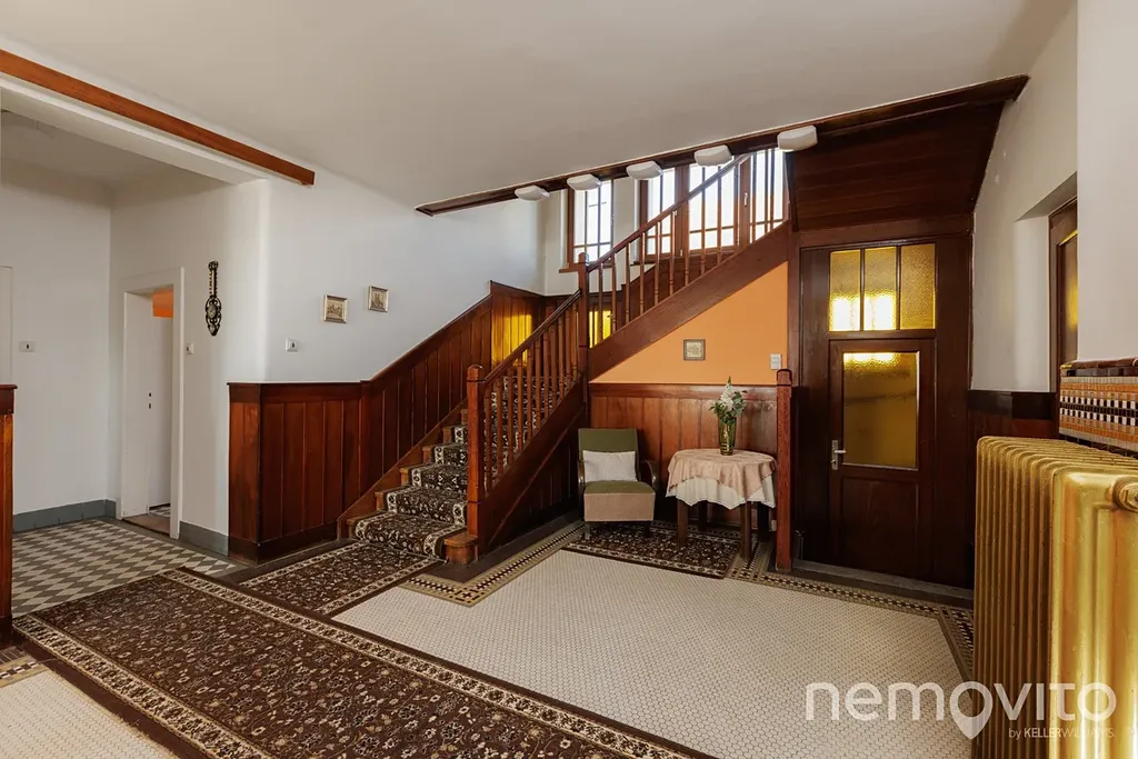Dominantu stavby tvoří téměř 40 metrová vstupní hala se schodištěm, do které je možné opět umístit kamna. Původní dřevěné schodiště, obložení stěn i mozaiková podlaha jsou skutečnou pastvou pro oči každého fanouška starých domů. Přestože má téměř 90 let, dispozice je řešena velmi prakticky. Na každém podlaží je sociální zázemí a pokoje jsou prostorné. Ložnice jsou navíc orientované směrem do zahrady, tedy na západní stranu.