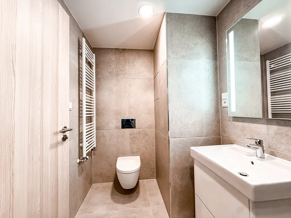 - Koupelna se sprchovým koutem a pračkou