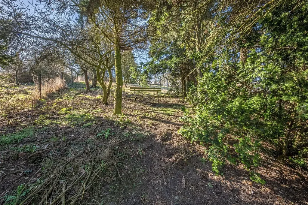 Zahrada o výměře 537 m² je mírně svažitá a osázená ovocnými stromy.