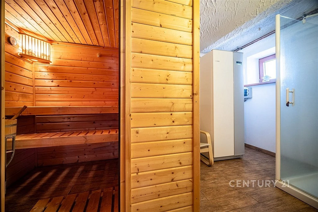 V přízemí se dále nachází velká univerzální místnost, wellness se saunou a sprchovým koutem a také samostatné WC.