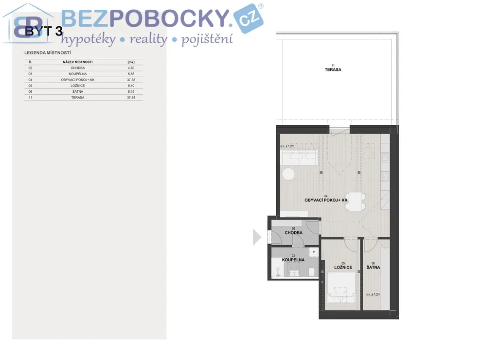 plocha 37,60m2 s terasou 29,92m2.