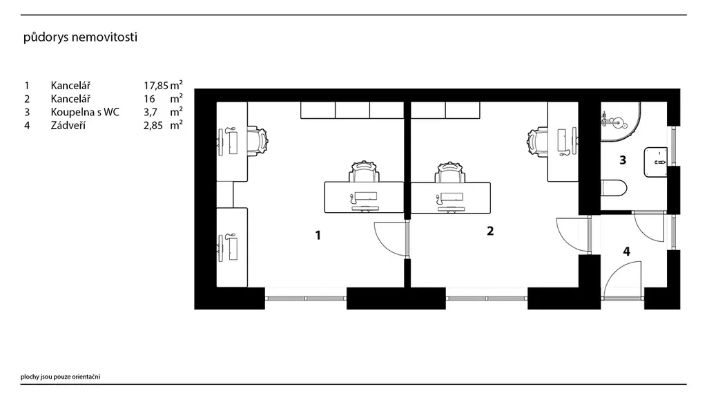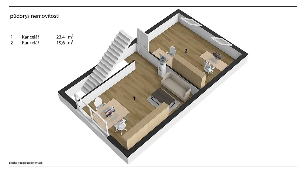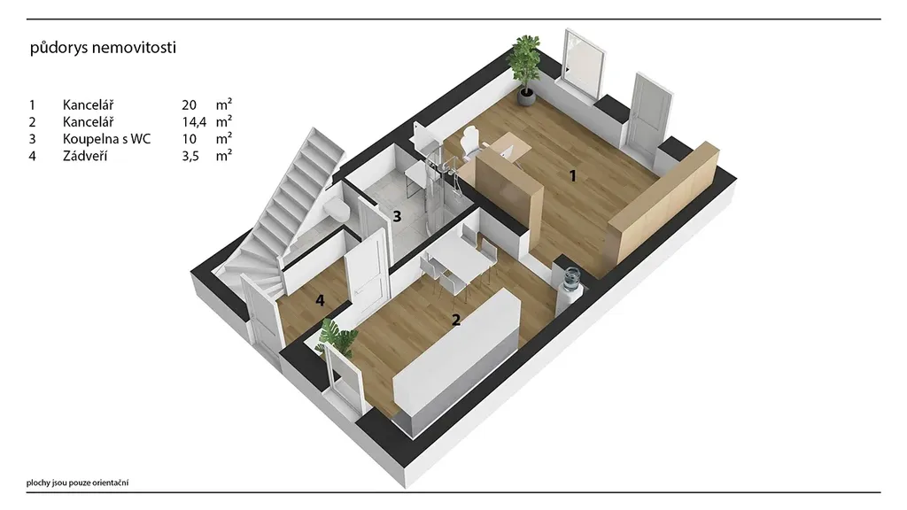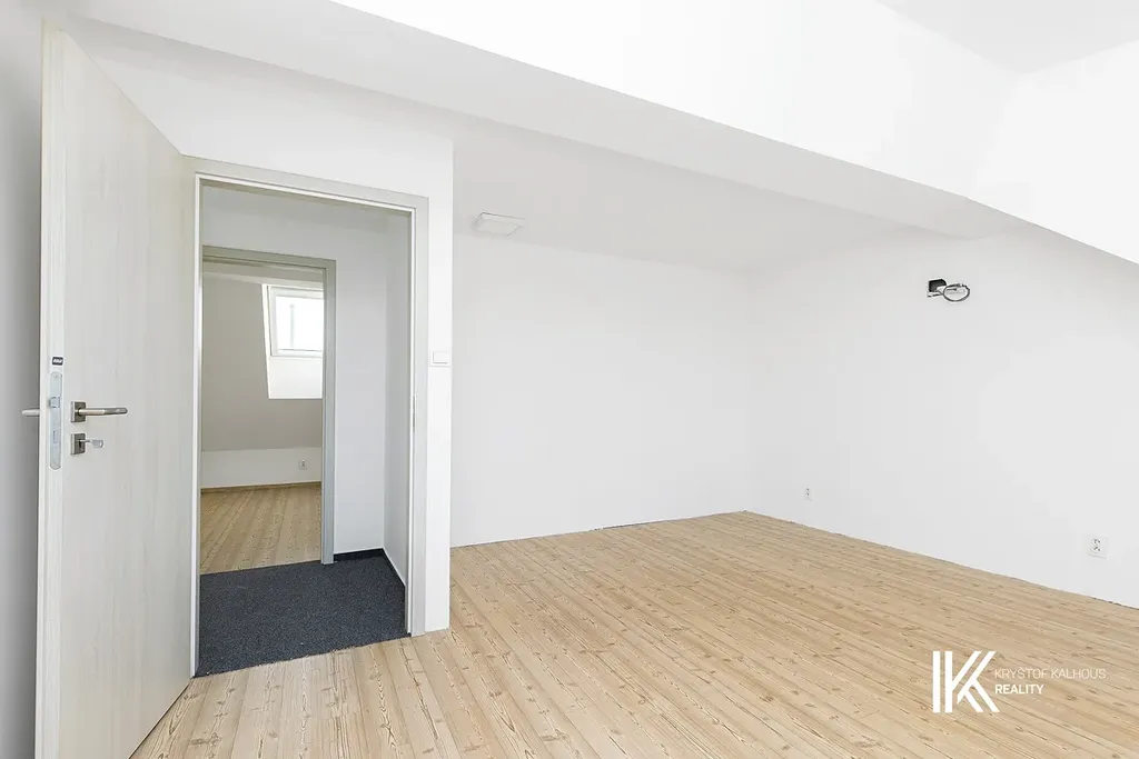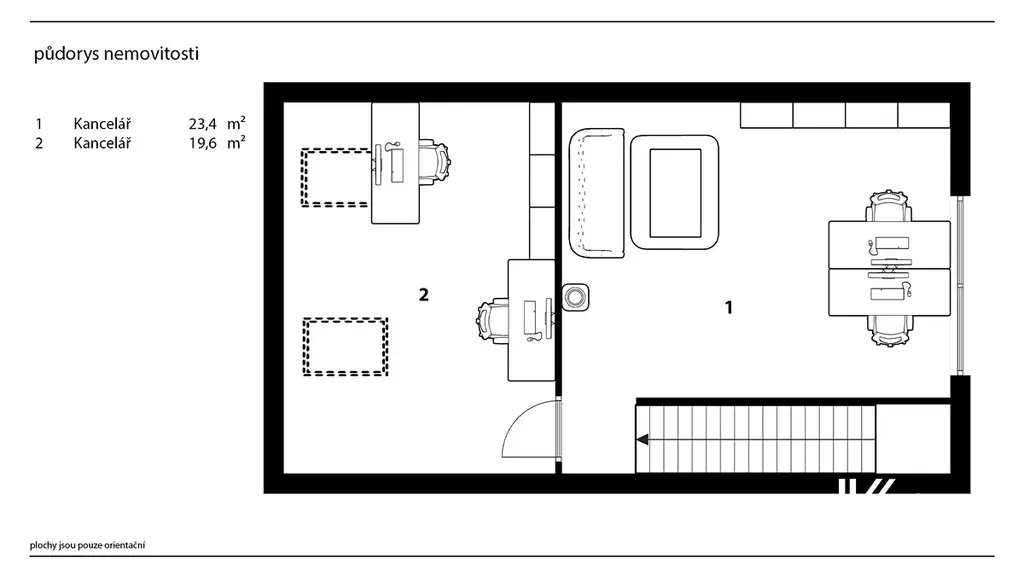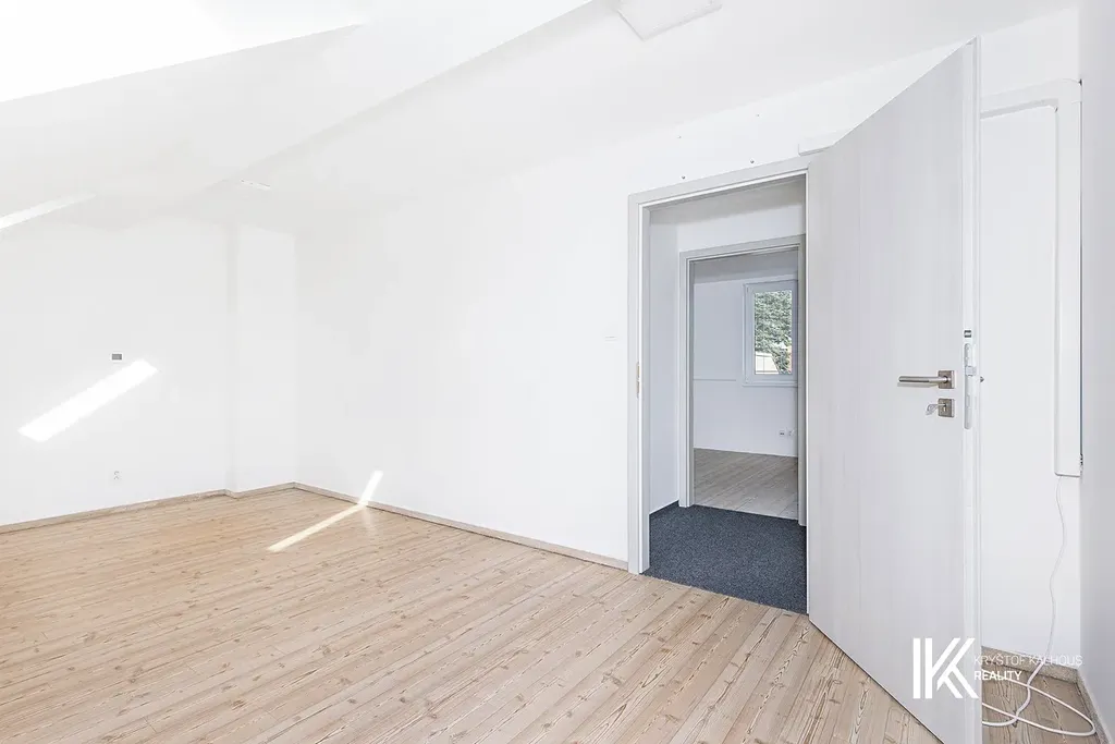 Hlavní budova má také druhý, zadní vstup ze dvora, vhodný zejména pro zaměstnance pro vstup rovnou do zázemí či horního patra. Po schodišti se dostanete do druhého podlaží, kde se nacházejí dvě samostatné místnosti vhodné jako kanceláře, jednací místnosti nebo další obchodní prostory. Dispozice patra umožňuje oddělené fungování jednotlivých částí firmy, případně kombinaci administrativy a obchodního provozu. Díky umístění nad prodejnou působí patro klidněji a je vhodné pro práci, která vyžaduje soustředění.