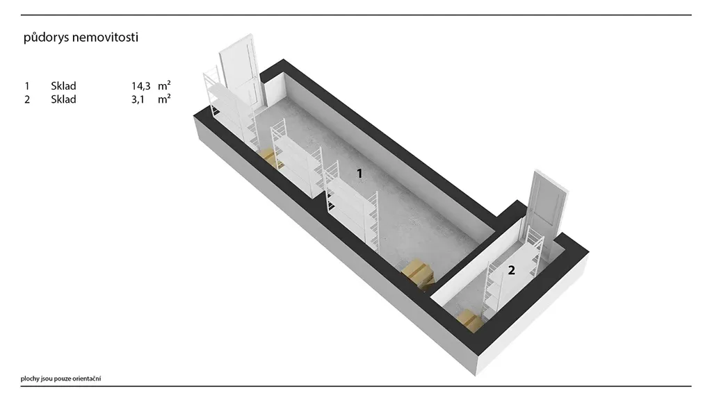 Druhou stavbu ve dvoře tvoří samostatná vydlážděná místnost, vhodná jako dílna, sklad, montážní místnost nebo jednoduchá výroba, případně jako technické zázemí firmy. Výhodou je samostatné umístění ve dvoře, které umožňuje provoz bez rušení hlavní části objektu.