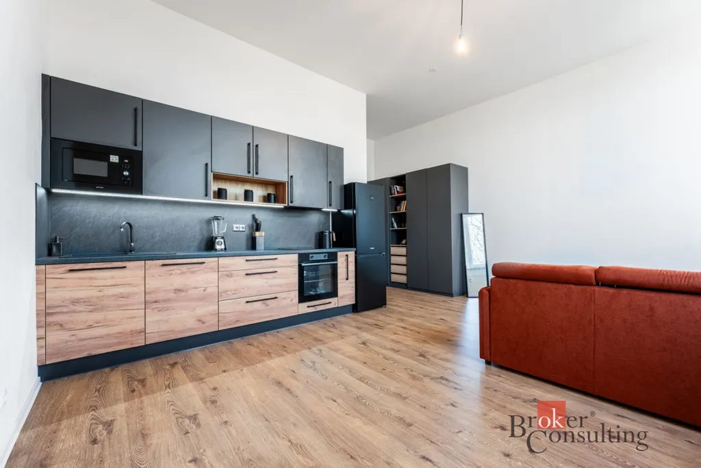 Po vstupu do bytu projdete chodbou do prostorného obývacího pokoje propojeného s moderním kuchyňským koutem v elegantním designu. Kuchyňská linka je vybavena troubou, mikrovlnnou troubou, indukční varnou deskou, digestoří a myčkou.