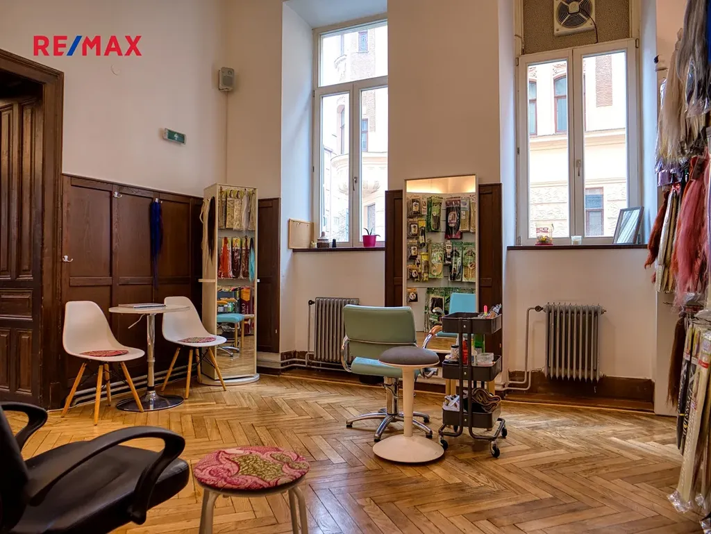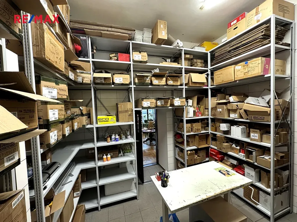 Dále je k dispozici oddělená místnost vhodná jako salon nebo kancelář a zázemí (2x sociální zařízení) včetně skladu.