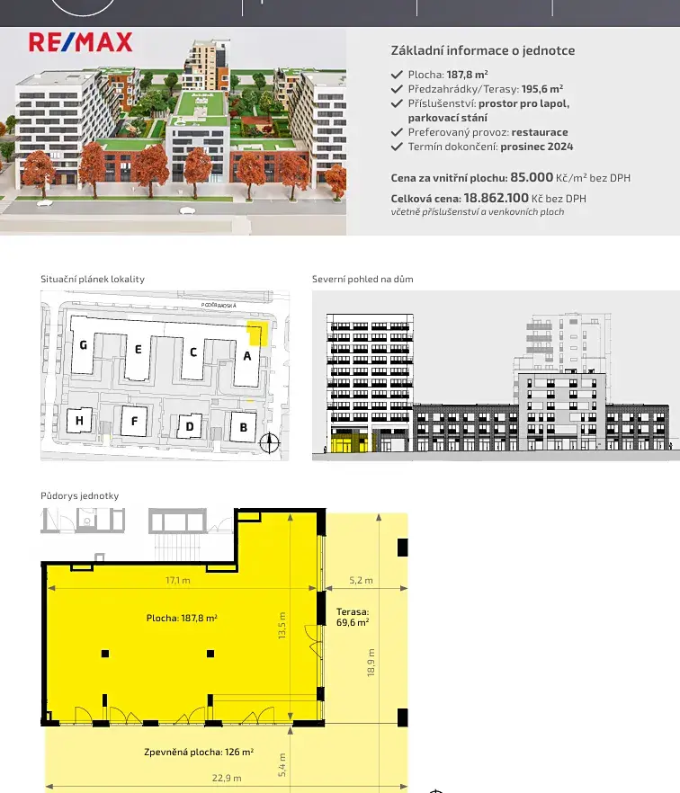 Nabízené prostory mají plochu od 188 m2 a 103 m2 s využitelností pro gastro, showroom / prodejnu nebo služby. Všechny prostory jsou umístěny v přízemí bytových domů s orientací směrem do ulice. Nabídka ve stavu SHELL & CORE umožnuje přizpůsobení prostor potřebám budoucího nájemce, ev. je možná dohoda na dokončení ze strany pronajímatele.