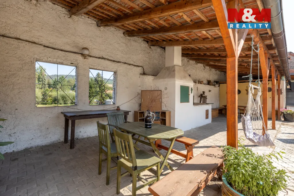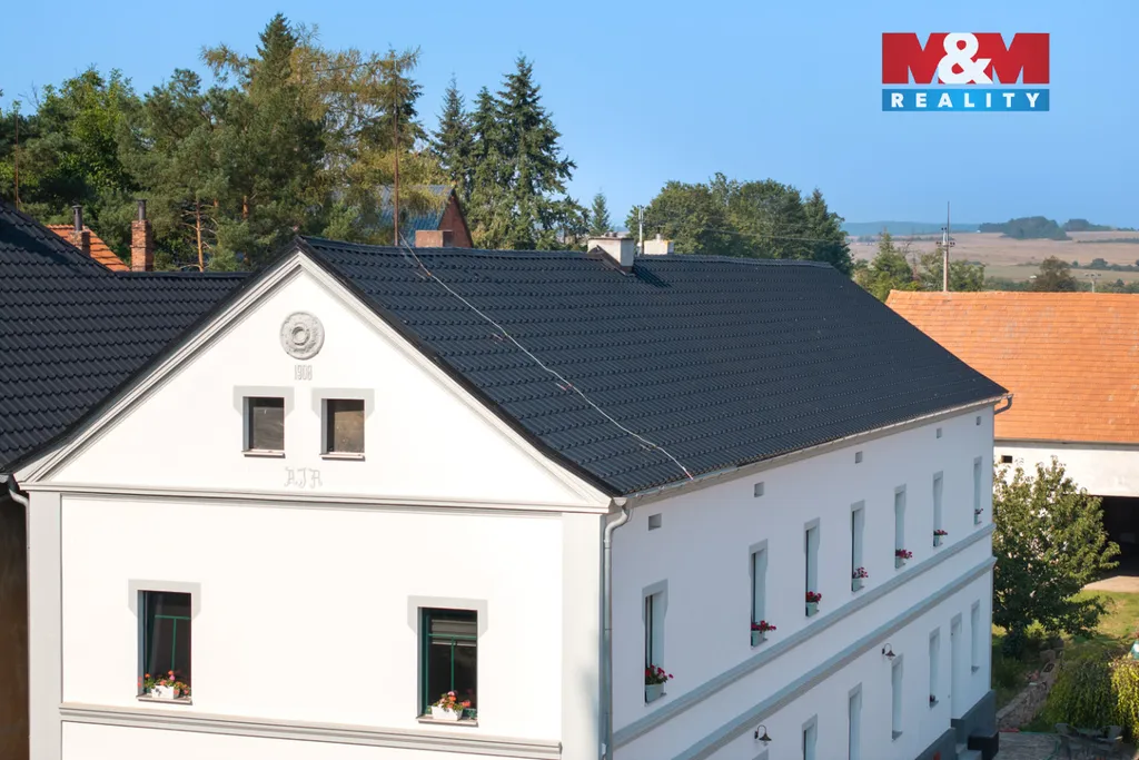 Prodej rodinného domu, bývalého statku, který původně sloužil jako penzion, nyní se jedná o rodinné sídlo v malé obci Očihovec, u obce Blšany, okr. Louny, 6 km ke křižovatce Praha (70 km), Karlovy Vary (50 km), které se rozkládá na pozemku 7 tis. m². Kolem dvora je obytný dům, velká stodola, podsklepený domek s garáží, pergola a krytý plavecký bazén. Dům je po rekonstrukci, obytná plocha 500 m². Vzhledem k ubytovacím možnostem s koupelnami a velké stodole, je nemovitost byla vhodná i pro konání svatebních hostin. V 1.NP se nachází kuchyň, 5 místností, 2 koupelny s WC, dvě komory a technická místnost s vybavením k tepelnému čerpadlu a dvěma bojlery. Ve 2.NP se nachází 6 pokojů a 5 koupelen s toaletou. Dům má novou střechu, fasádu a okna. Je vytápěn tepelným čerpadlem. Jako záložní zdroj je zde automatický kotel na pevná paliva. Elektřinu z větší části zajišťuje fotovoltaická elektrárna. Pitná voda je připojena z vodovodního řadu. Užitkovou spotřebu vody zajišťuje studna.