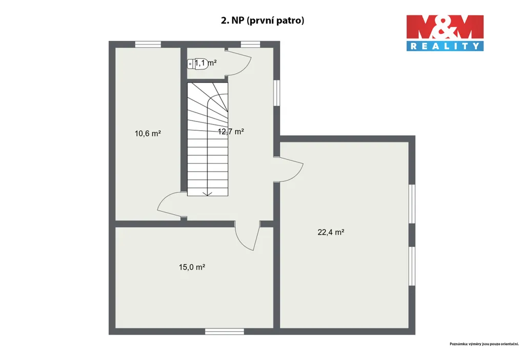 První patro nabízí dvě prostorné obytné místnosti a samostatné WC.