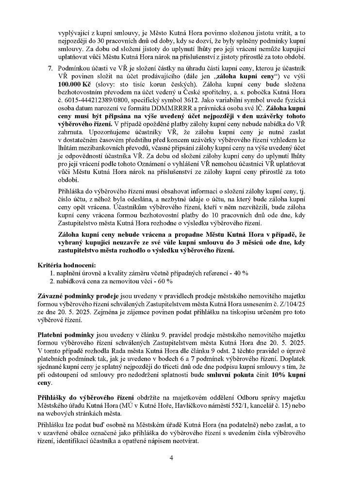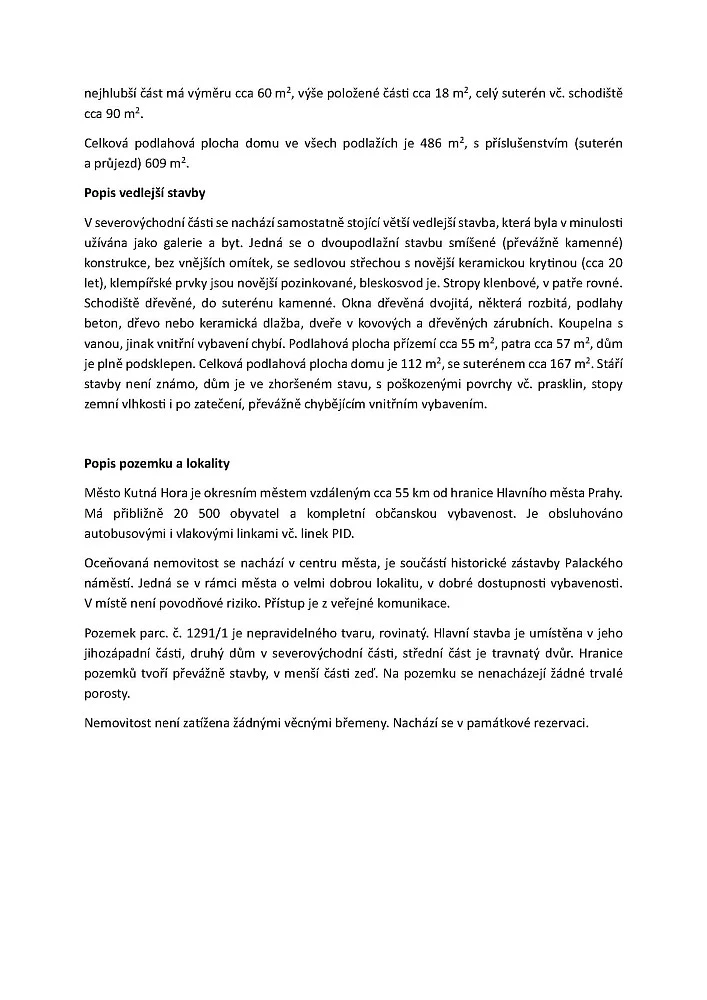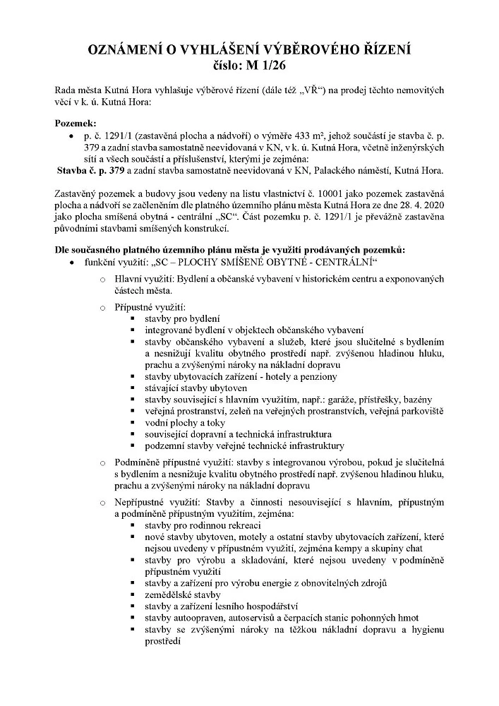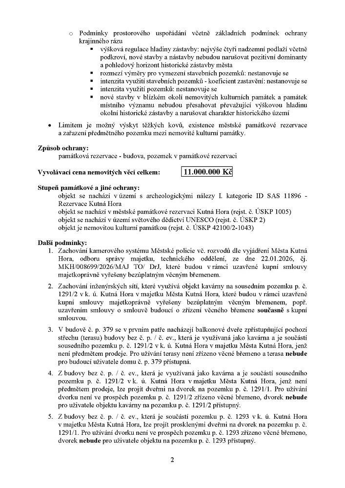 Předmětem prodeje je pozemek p. č. 1291/1 (zastavěná plocha a nádvoří) o výměře 433 m², jehož součástí je stavba č. p. 379 a zadní stavba samostatně neevidovaná v KN, v k. ú. Kutná Hora, včetně inženýrských sítí a všech součástí a příslušenství, kterými je zejména stavba č. p. 379 a zadní stavba samostatně neevidovaná v KN, Palackého náměstí, Kutná Hora.