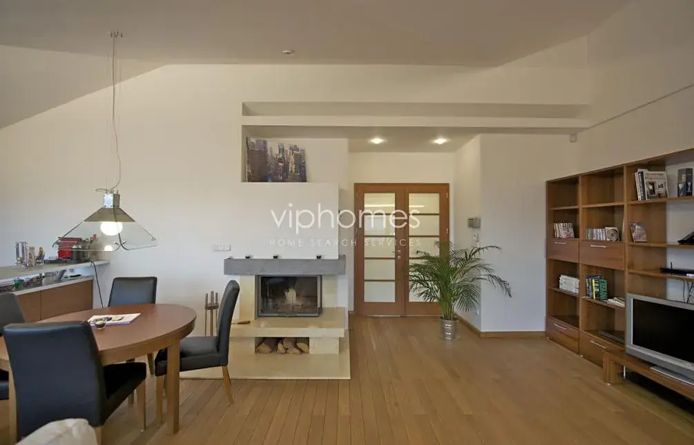 Interiér bytu tvoří 2 ložnice s vestavěnými skříněmi a výhledem do zeleně, obývací pokoj s plně vybaveným kuchyňským koutem, funkčním krbem, koupelna s vanou, bidetem a toaletou, technická komora, toaleta pro hosty a vstupní chodba s vestavěnými úložnými prostory. S obývacího pokoje je přímý vstup na jižní terasu s výhledem na Prokopské údolí. V bytě jsou masivní podlahy z dubového dřeva, stejně jako dveře s bezpečnostním sklem, krb obložený mramorem, dlažba (koupelny) z Marazzi kamene, Villeroy & Boch sanitární a koupelnové armatury (Magnum Series), příslušenství Ideal Standard. Telefonní linka, alarm, satelitní připojení, Wi-Fi, osázená terasa, 1 parkovací stání, možnost užívání zahrady. Byt je zařízen nábytkem Natuzzi, TV plasma.