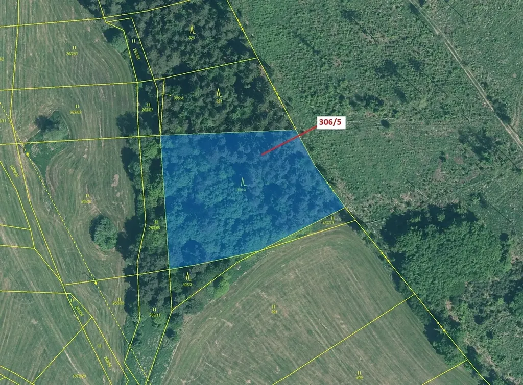 Lesní pozemek o výměře 4906 m2, parcelní číslo 306/5, podíl 1/1, katastrální území Třešně u Záhoří, obec Záhoří, obec s rozšířenou působností Písek, okres Písek, Jihočeský kraj. Částečně po těžbě.