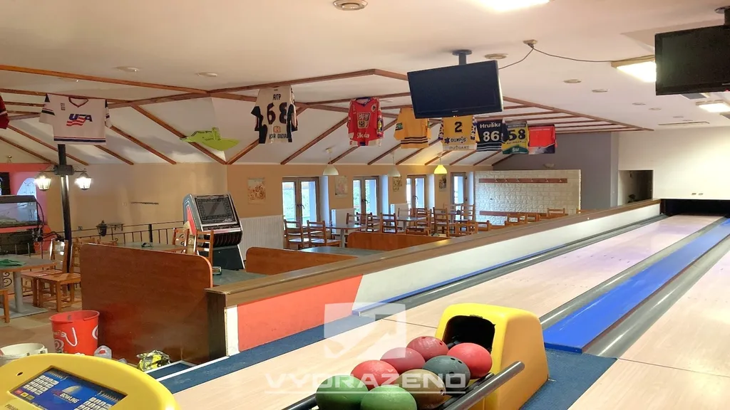 • 2. nadzemní podlaží: prostor s bývalými bowlingovými drahami, bar, salónek, terasa a sociální zázemí