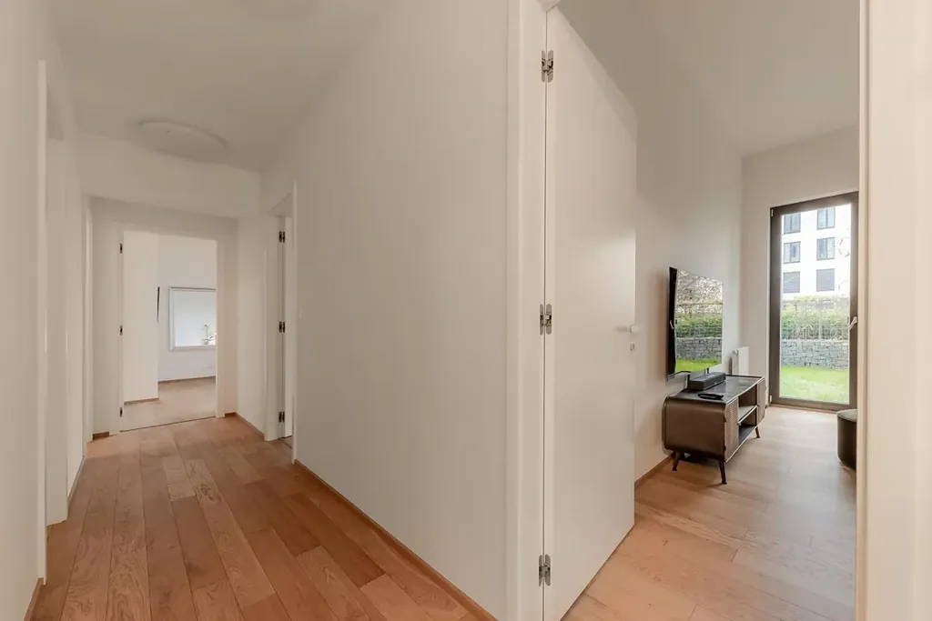 Zařízený byt se nachází v 1. nadzemním podlaží v novostavbě. Výška stropu je 3 metry. Interiér bytu tvoří obývací pokoj o velikosti 65 m2, hlavní ložnice o velikosti 23 m2 s šatnou a koupelnou se sprchovým koutem, pokoj pro hosty s vlastní koupelnou se sprchovým koutem, dětský pokoj s šatnou a s vlastní koupelnou se sprchovým koutem, další pokoj, koupelna s vanou, samotné WC, komora. Vstup na terasu a zahrádku je možný ze všech pokojů. Okna mají venkovní žaluzie.