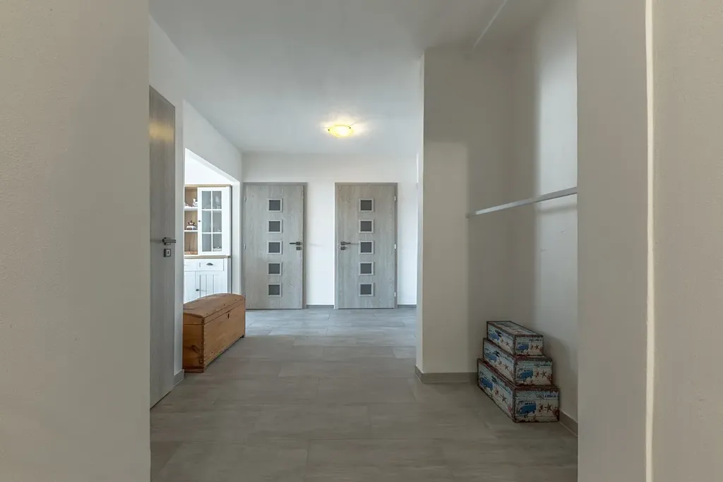 S chodby je vstup do všech místností, takže pokoje jsou neprůchozí s výhledem do zahrady. K domu patří společná zahrada která je dostupná pro všechny bytové jednotky.