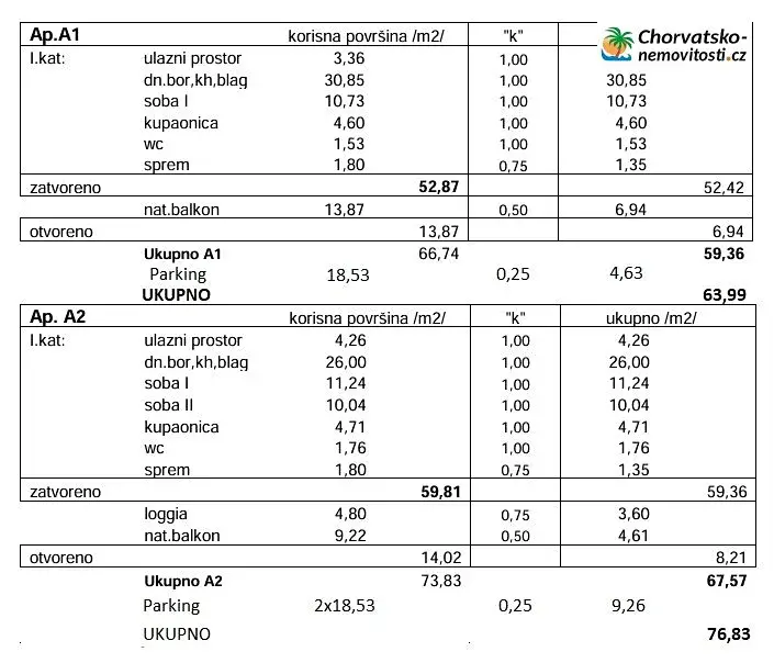 Na prodej třípokojový byt (A2) o celkové ploše 76,83 m2 v prvním patře novostavby v Novalji
