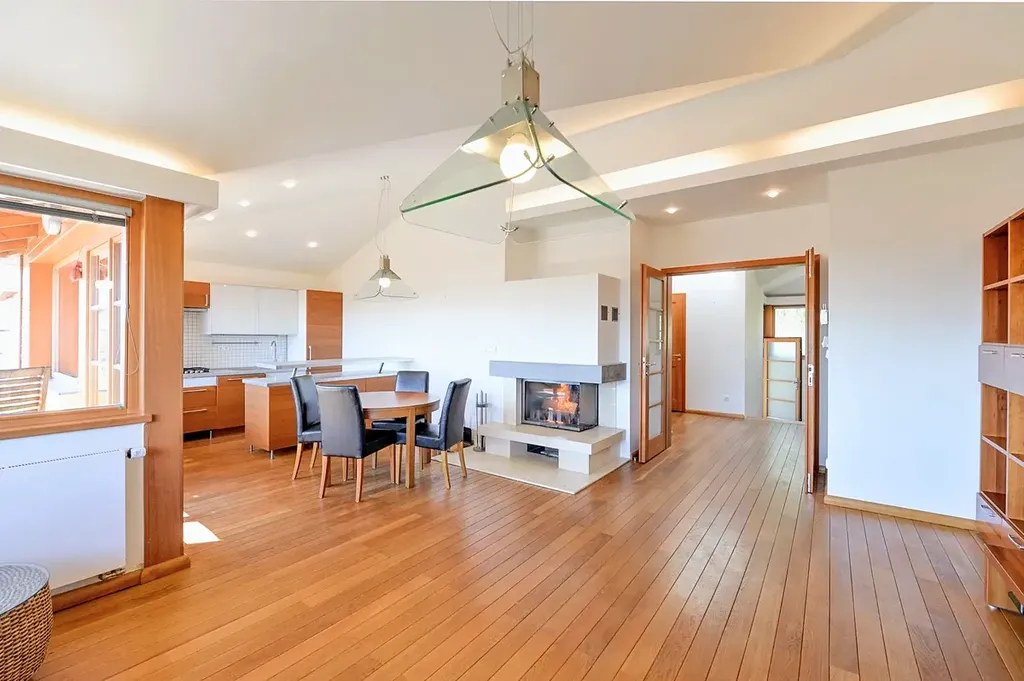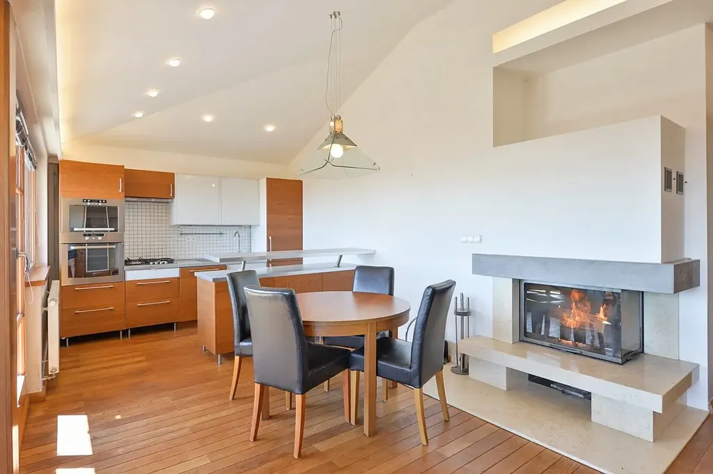 Tento výjimečný byt splňuje nároky na moderní a komfortní bydlení. Dominantou je elegantní kuchyňská linka na míru vybavená špičkovými vestavěnými spotřebiči, včetně indukční varné desky, horkovzdušné trouby, myčky nádobí a lednice s mrazákem.V obývacím pokoji je krb, interiér je vkusně a kompletně zařízen nábytkem dle fotografií, k dispozici jsou vestavěné skříně v obou ložnicích a pračka. Vysoký standard podtrhují kvalitní dřevěné podlahy v kombinaci s elegantní dlažbou.