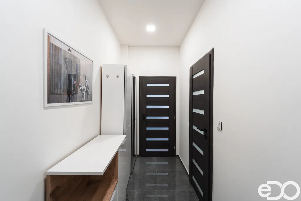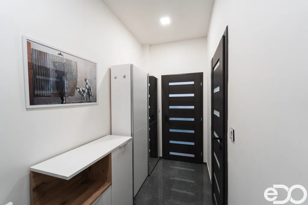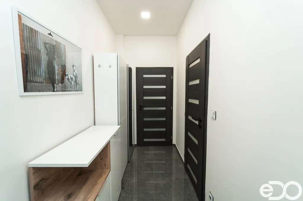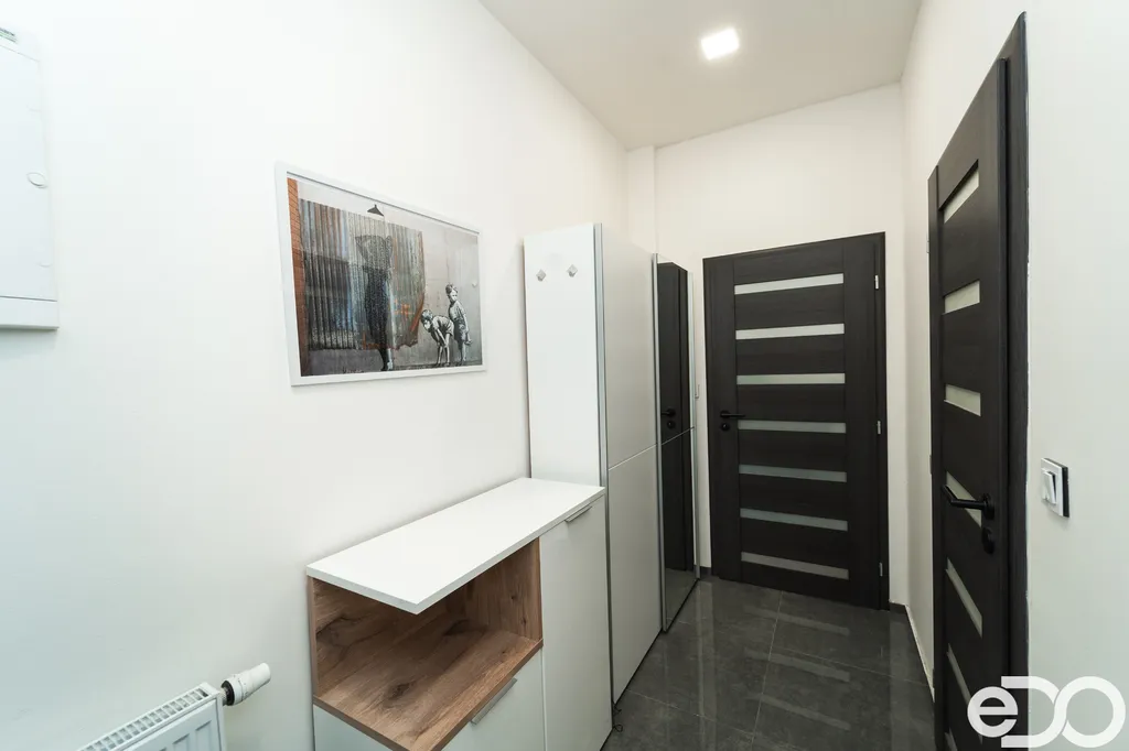 Samotný byt má podlahovou plochu 43 m² a je po čerstvé rekonstrukci. Interiér působí svěže, jednoduše a funkčně. Hlavní obytný prostor nabízí dostatek místa jak pro pohodlné bydlení jednotlivce, tak pro mladý pár. Kuchyňská linka je vybavena sklokeramickou varnou deskou, vestavěnou troubou a recirkulační digestoří. Koupelna je řešena prostorným sprchovým koutem, s dostatkem místa pro pračku i sušičku, toaleta je součástí koupelny. V obytné části je položena laminátová plovoucí podlaha, v koupelně dlažba.