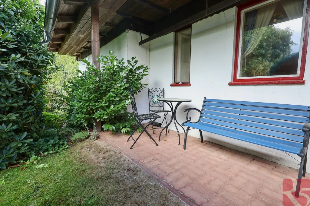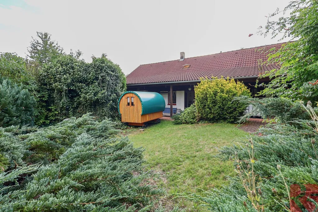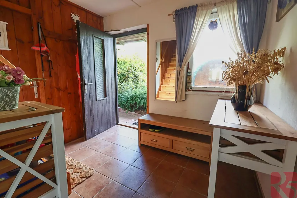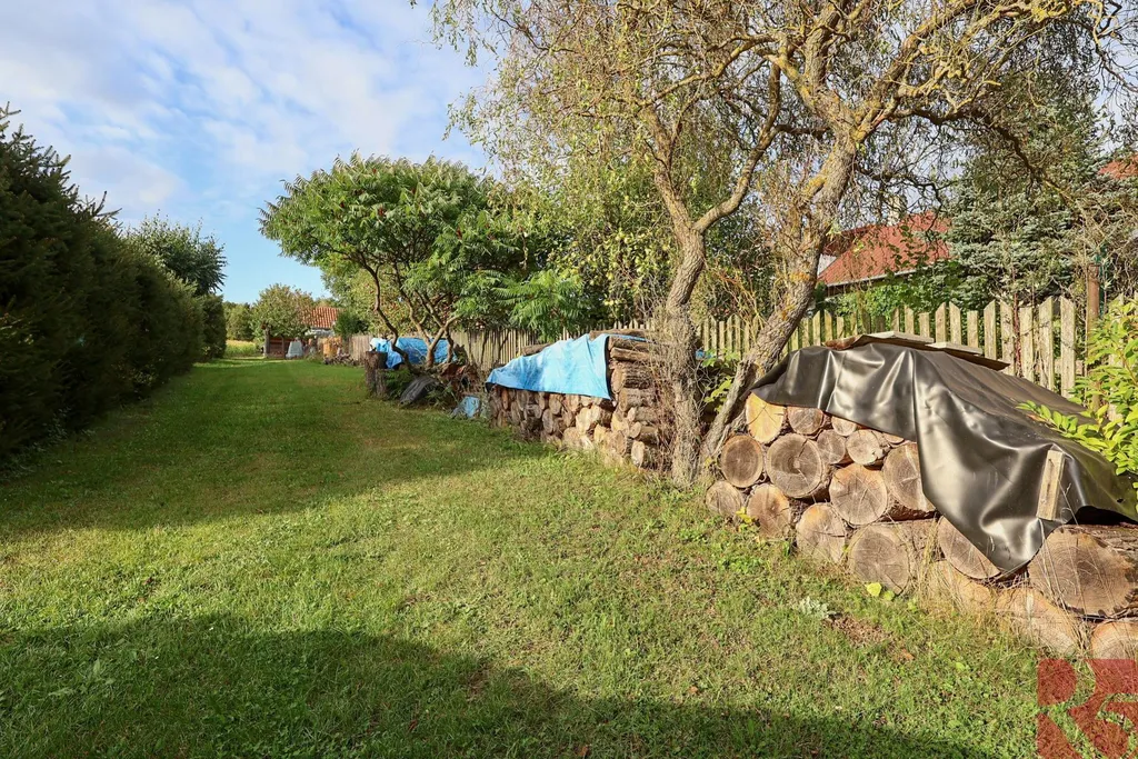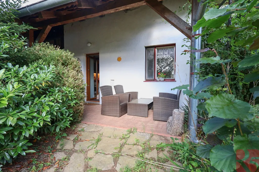 K domu je zahrada o rozloze 2 875m2 jen 30 m od domu, situovaná na hrázi rybníka s malým potůčkem, osázená ovocnými stromy, ideální k chovu zvířat, nebo pěstování zahradních a rostlinných plodin.