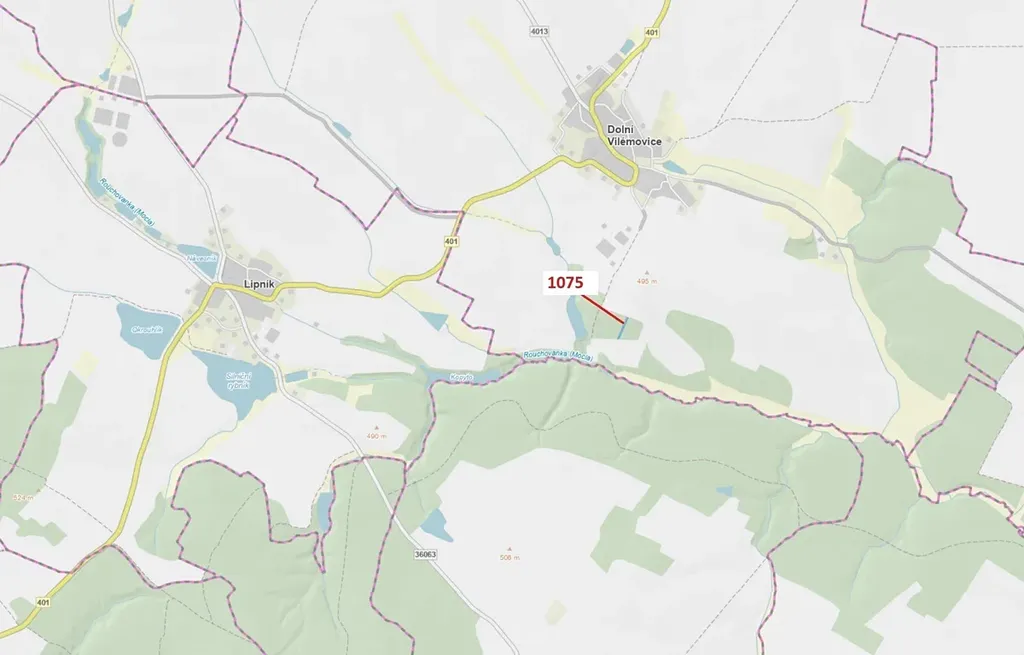 Lesní pozemek o výměře 1134 m2, parcelní číslo 1075, podíl 1/1, katastrální území Dolní Vilémovice, obec Dolní Vilémovice, obec s rozšířenou působností Třebíč, okres Třebíč, Kraj Vysočina. Po těžbě.
