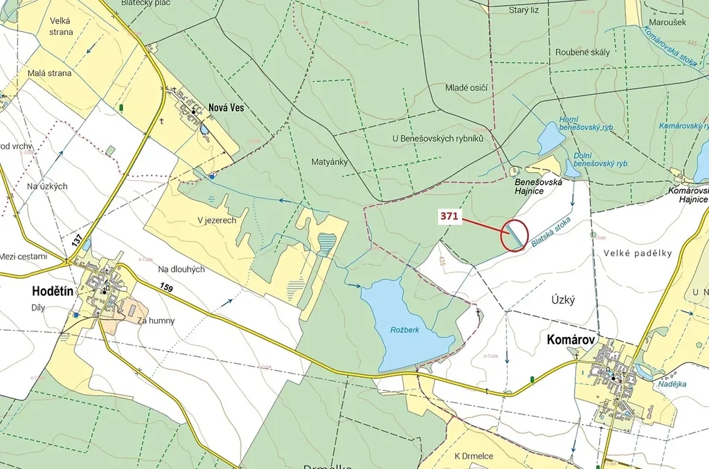 Lesní pozemek o výměře 2175 m2, parcelní číslo 371, podíl 1/1, katastrální území Komárov u Soběslavi, obec Komárov, obec s rozšířenou působností Soběslav, okres Tábor, Jihočeský kraj. Po těžbě.