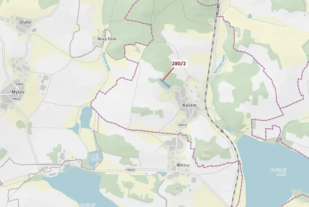 Lesní pozemek o výměře 4872 m2, parcelní číslo 280/2, podíl 1/1, katastrální území Kovčín, obec Kovčín, obec s rozšířenou působností Horažďovice, okres Klatovy, Plzeňský kraj. Po těžbě.