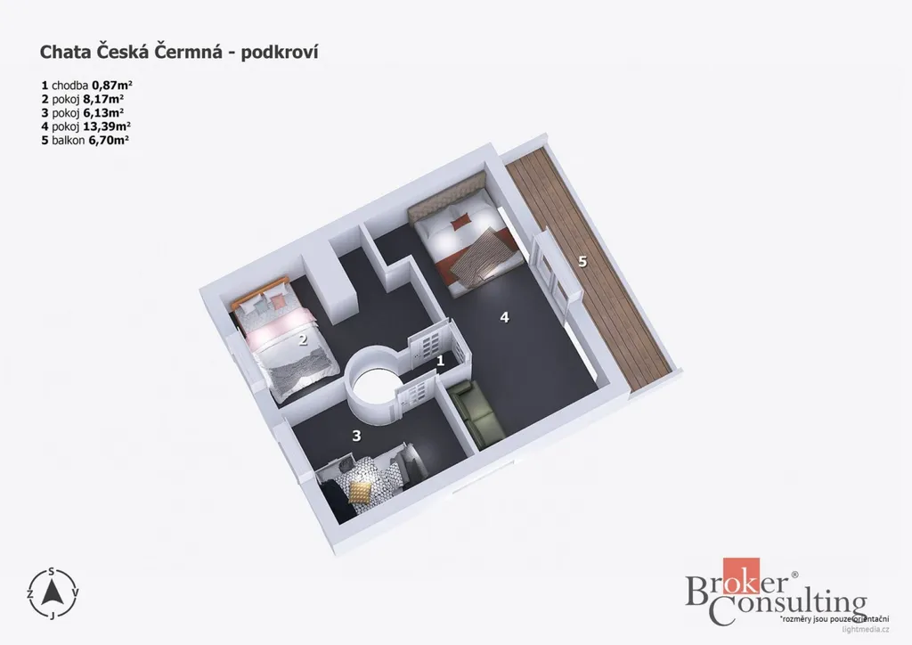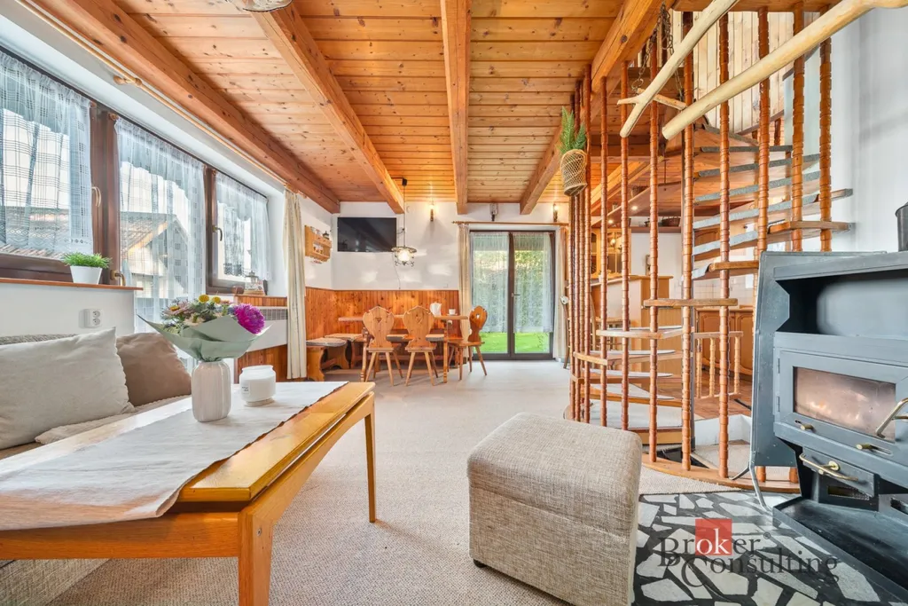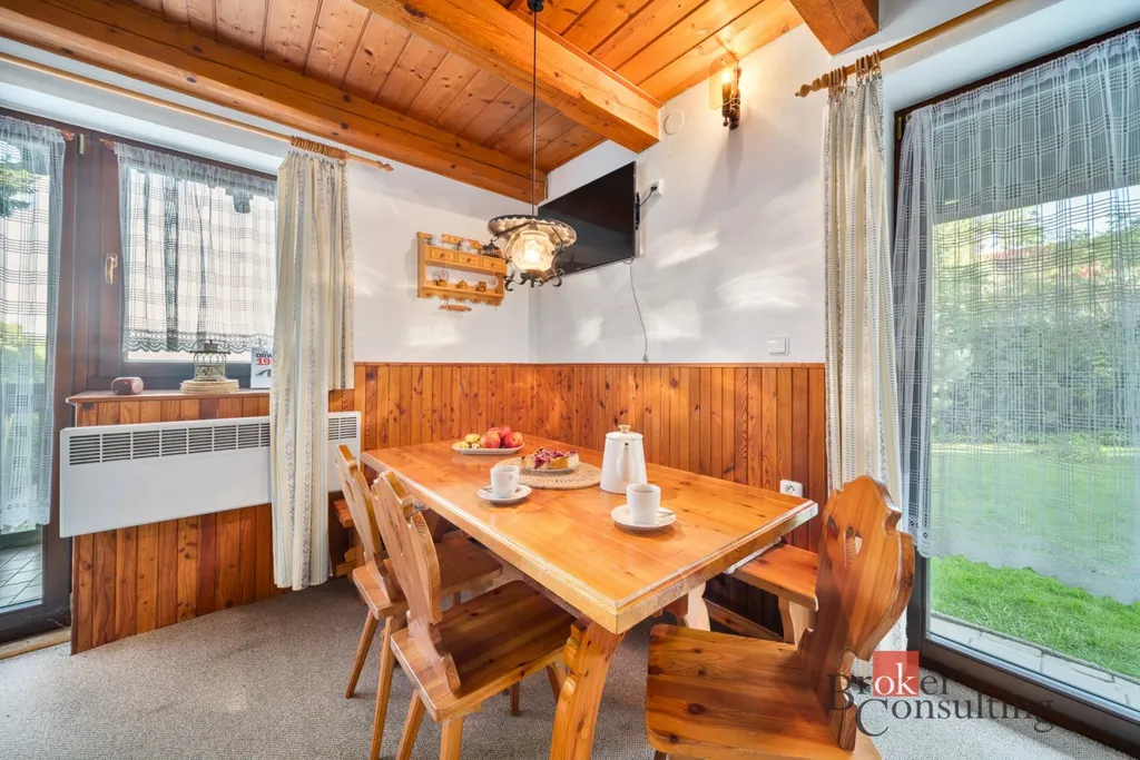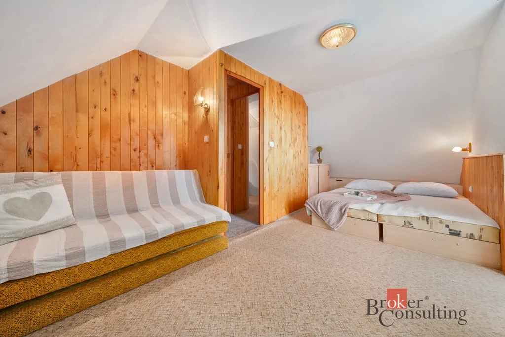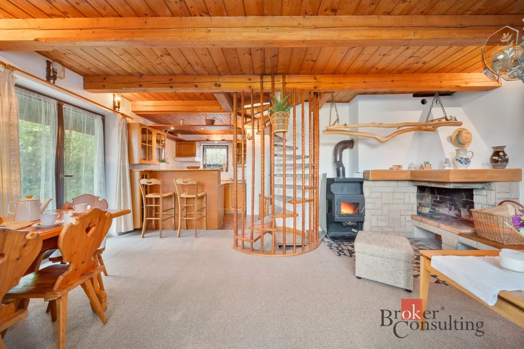 V přízemí se nachází kuchyně spojená s obývacím koutem a jídelním stolem. Z obývacího pokoje je přímý vstup na slunnou terasu, kde si vychutnáte ranní kávu nebo večerní posezení. V podkroví jsou tři útulné pokoje a balkon s nádherným výhledem do okolní přírody.