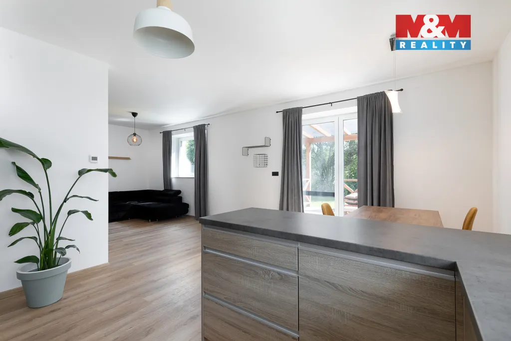 Interiér nabízí designovou kuchyni s vestavěnými spotřebiči, PODLAHOVÉ vytápění doplněné o kachlová kamna, dvě koupelny i dostatek úložných prostor včetně sklepa a praktického zázemí pod terasou.